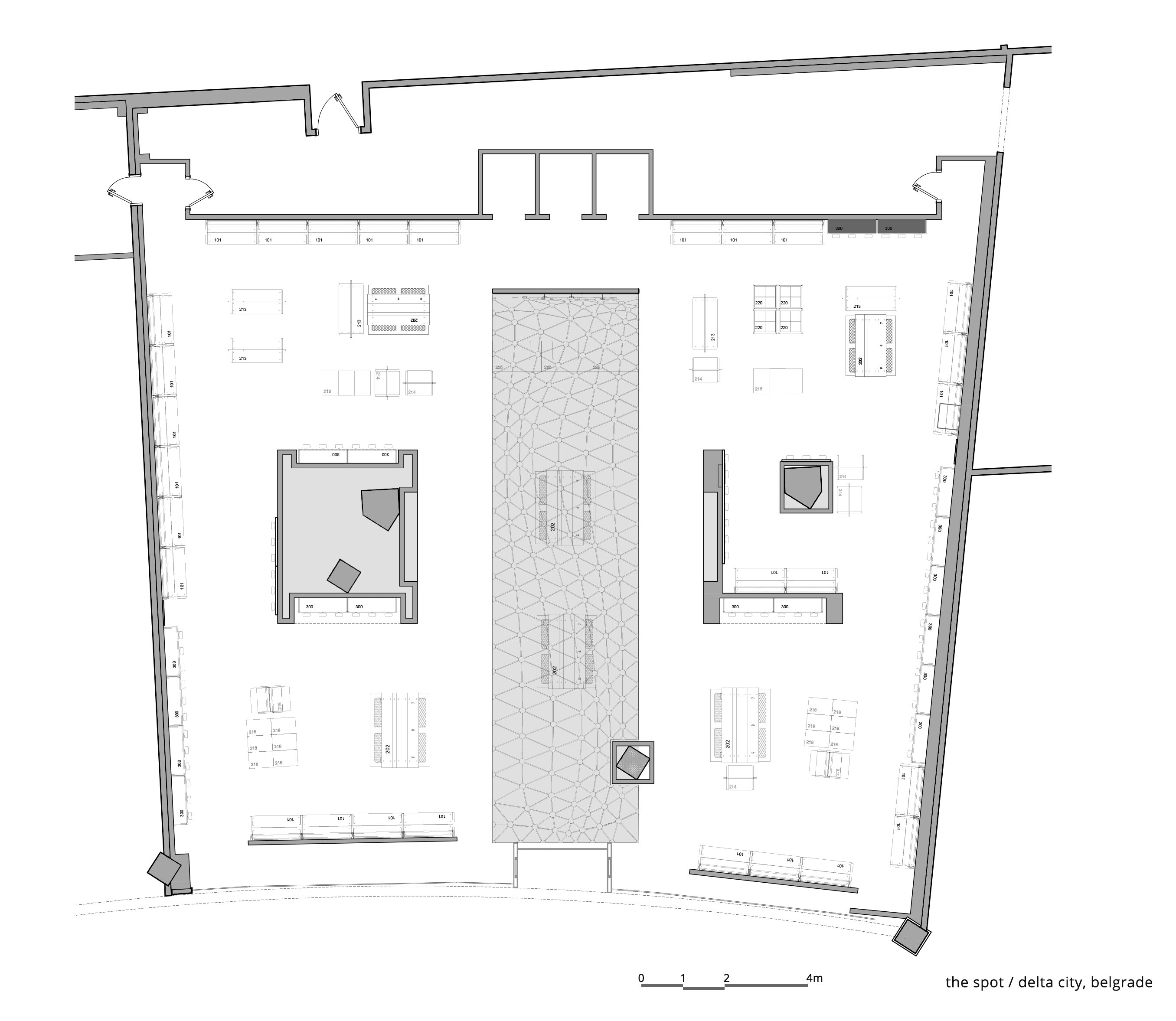 Trougaona šema je odabrana zbog svoje fleksibilnosti i prilagodljivosti različitim prostorima, uz očuvanje koncepta i prepoznatljivosti. U skladu s tim odabran je i materijal, koji se savršeno uklapa sa premium konceptom The Spota.