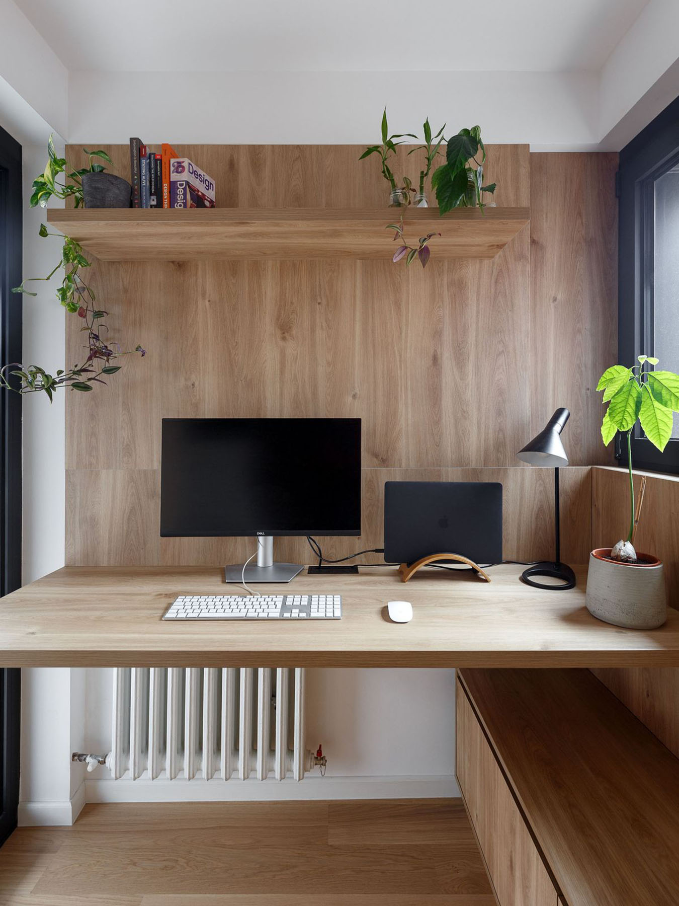 Uvođenjem radne sobe na mestu nekadašnje trpezarije dat je odgovor na sve izraženiju potrebu za radom od kuće. „Dizajnom radne zone kao toplog ambijenta sa drvenim elementima i izraženim prirodnim osvetljenjem, stvoren je prostor koji istovremeno funkcioniše kao zasebni blok i kao neodvojivi deo celine stana“ – navodi arhitekta.