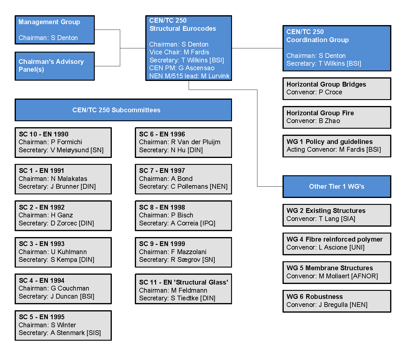 Razvoj Evrokodova je dodeljen tehničkom komitetu 250 (CEN/TC 250) čija je aktuelna struktura prikazana na slici 2. Evrokod 2 za projektovanje betonskih konstrukcija je pod nadležnosti potkomiteta 2 (CEN/TC 250/SC 2) unutar koga „operativni“ deo posla obavlja radna grupa 1 (CEN/TC 250/SC 2/WG 1). Drugim rečima, u radu potkomiteta 2 učestvuju predstavnici država članica CEN-a dok samo „pisanje“ standarda vrše individualni eksperti u radnoj grupi 1.