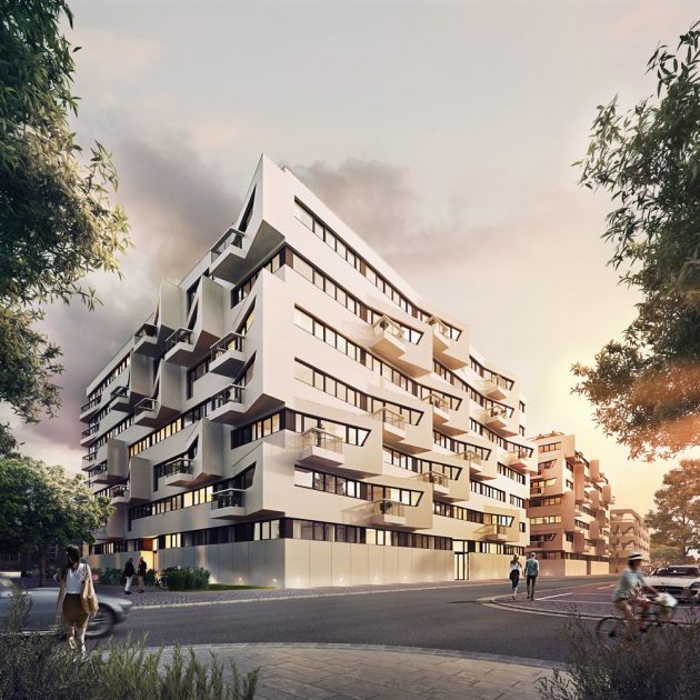 Reka Špreja bila je inspiracija za oblikovanje fasada novog bloka. Talasi i virovi reke, pokret vode i meandriranje toka poslužili su arhitektama iz GRAFT-a da oblikuju zgrade. Rezultat se može videti na ovim renderima ali i uživo od 2018. godine kada se očekuje završetak izgradnje, piše ArchDaily.