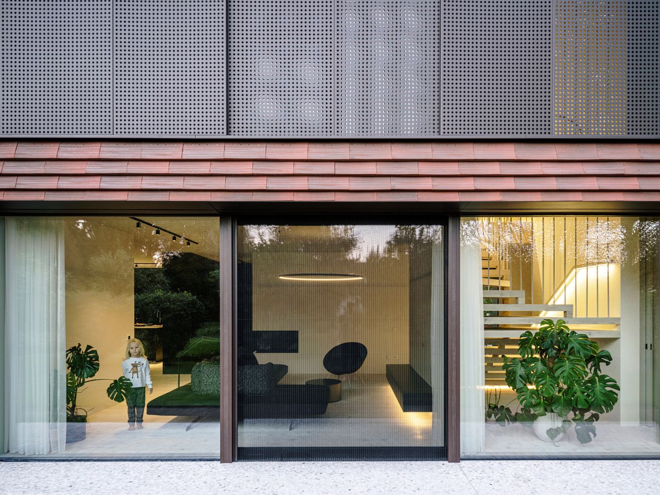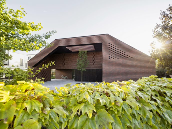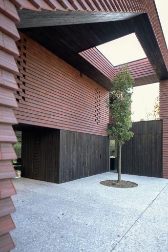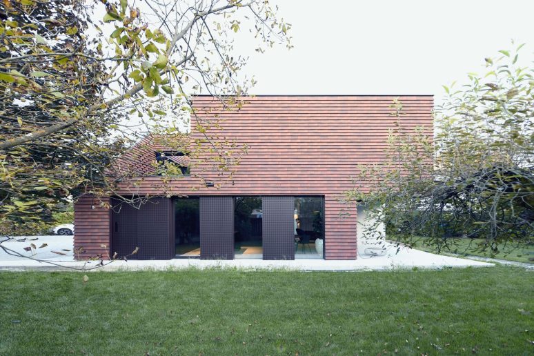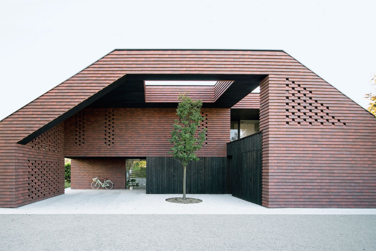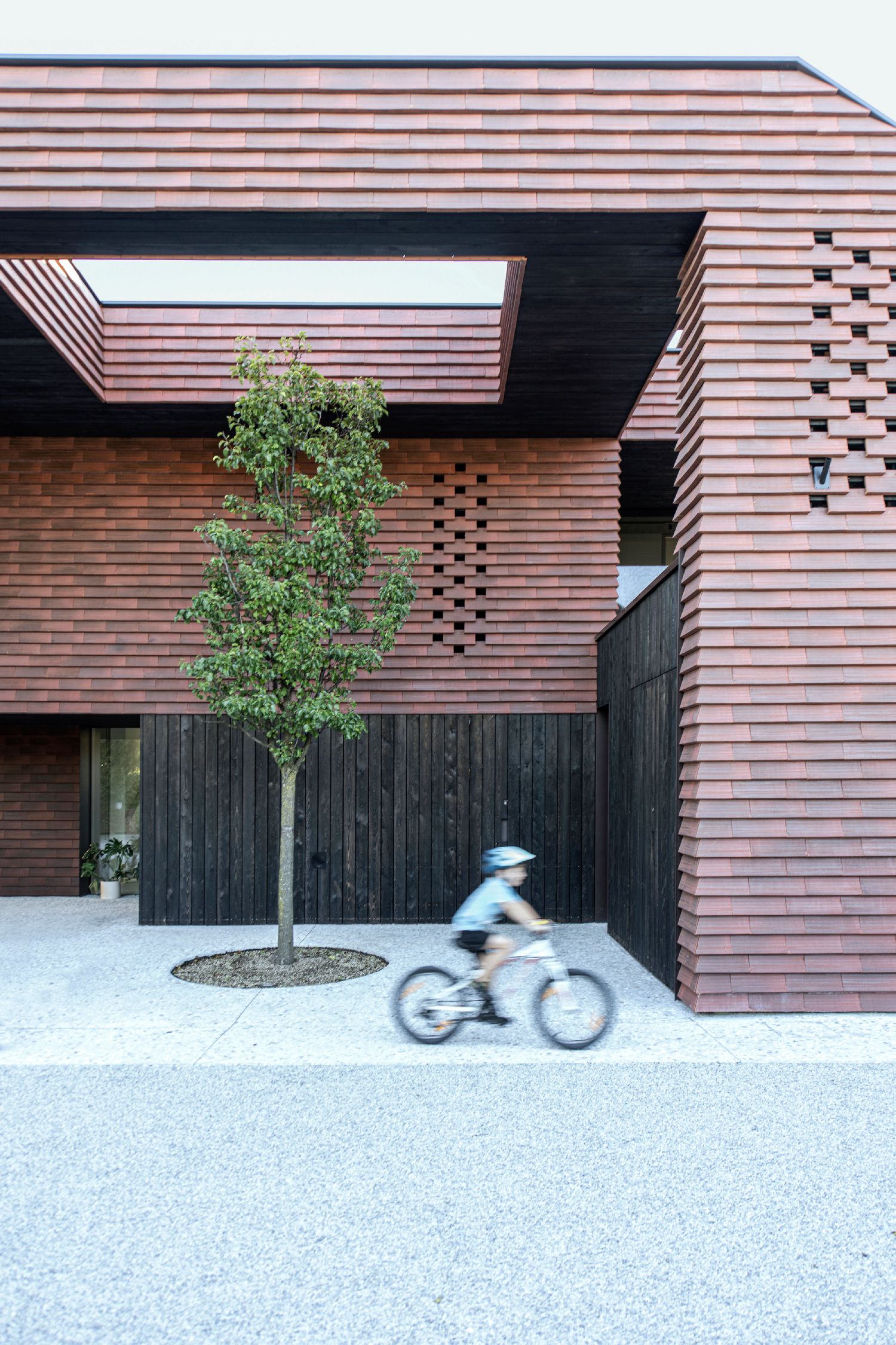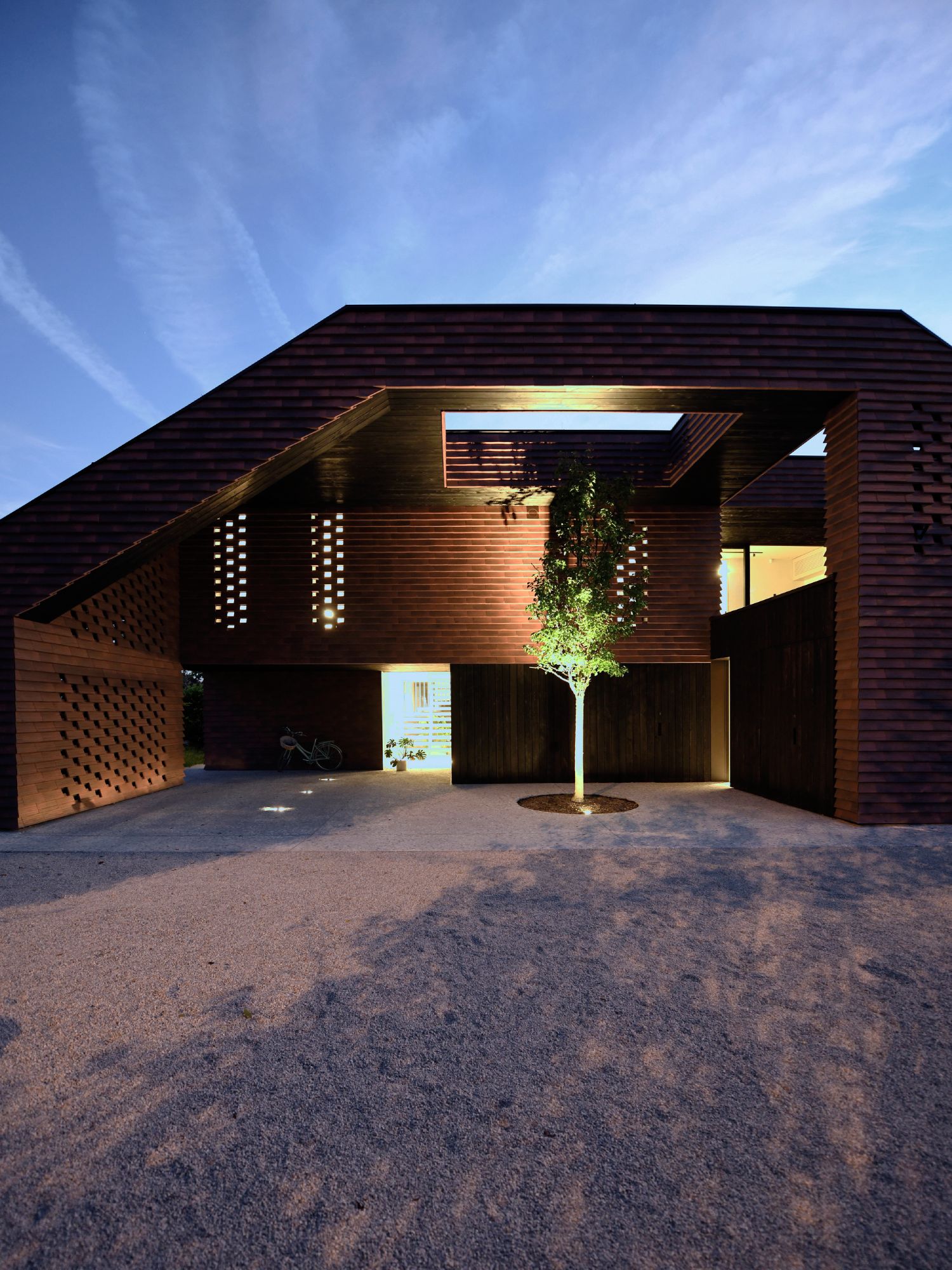 Vizuelno, nadstrešnica, ostava i kuća stvaraju jedinstveni volumen sa jednoobraznom teksturom koju čine crvene pločice, koje jednako pokrivaju i vertikalne i kose površine, te kreiraju perforiranu čipkastu strukturu, kažu arhitekte iz OFIS-a.