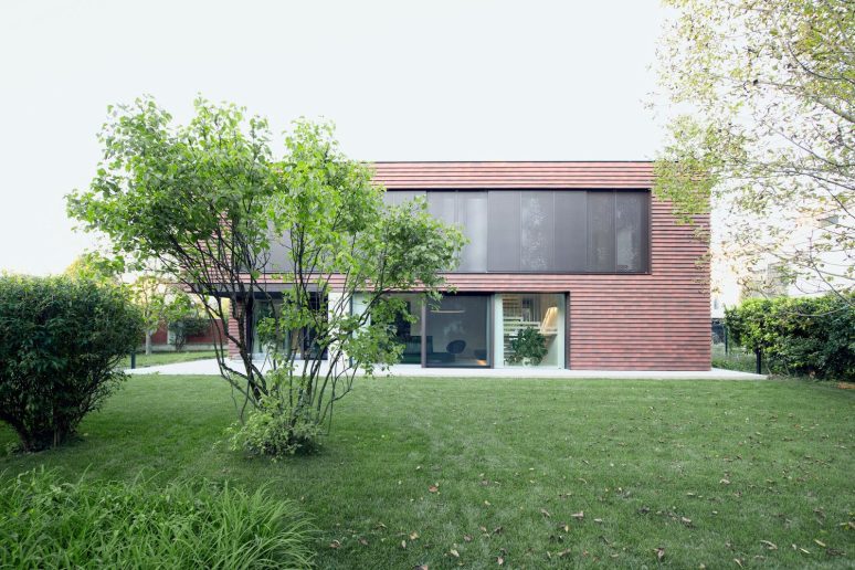 Budući da je na parceli zatečen vrt, kuća je izgrađena tako da se zadrži većina travnjaka i drveća, ali i da se uspostavi popločano područje pored ulaza gde bi deca mogla da se igraju i voze rolere.