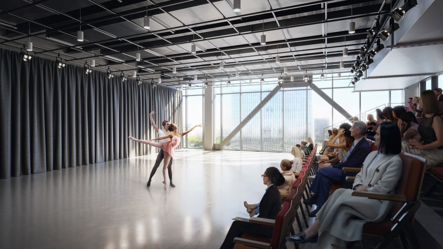 Četiri plesna studija profesionalne veličine, kao i fleksibilni studio teatar sa 100 sedišta „obmotani“ su staklenim fasadama, pružajući vizuelni pristup ka vežbama i nastupima koji se dešavaju u unutrašnjosti.