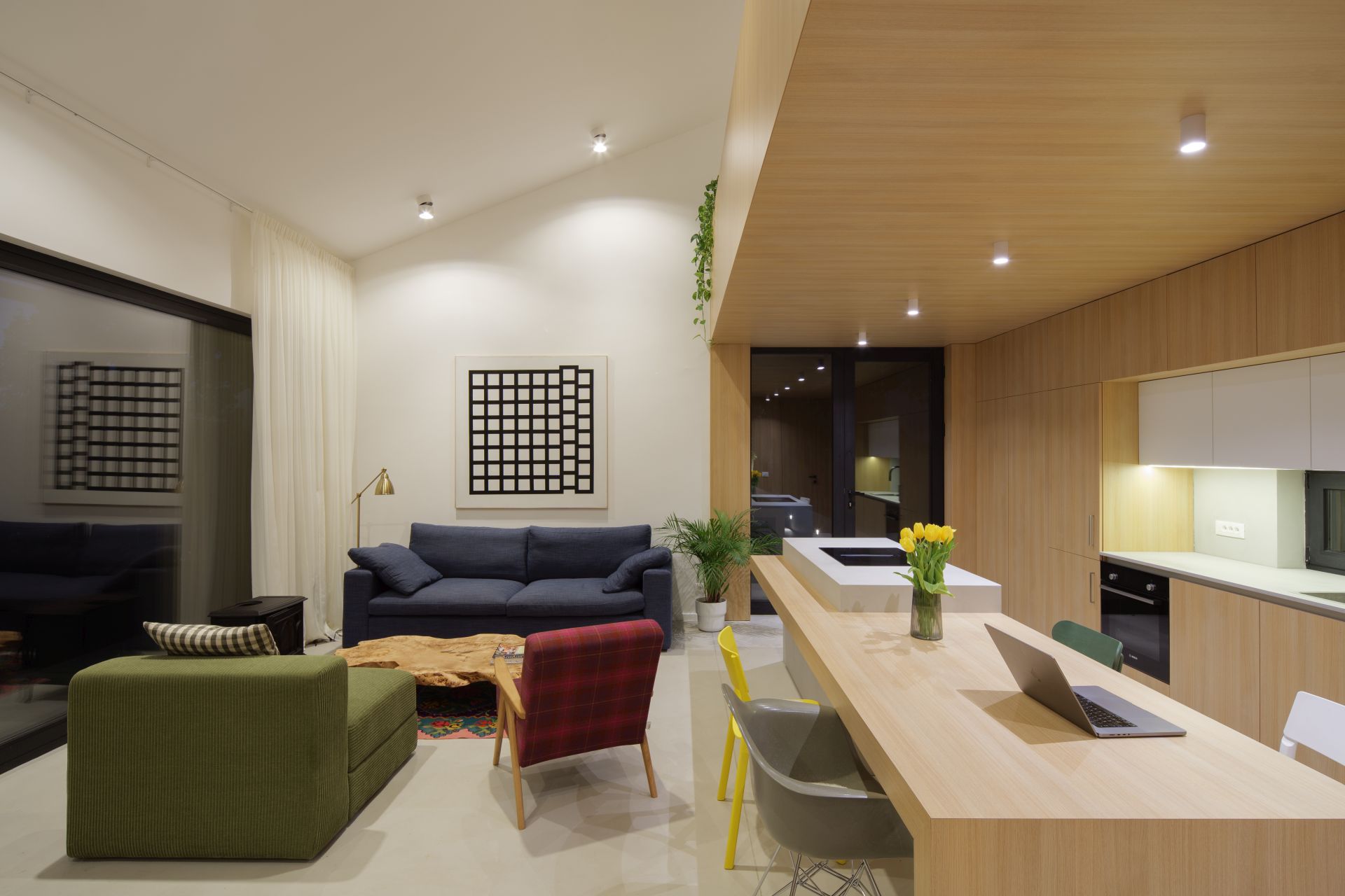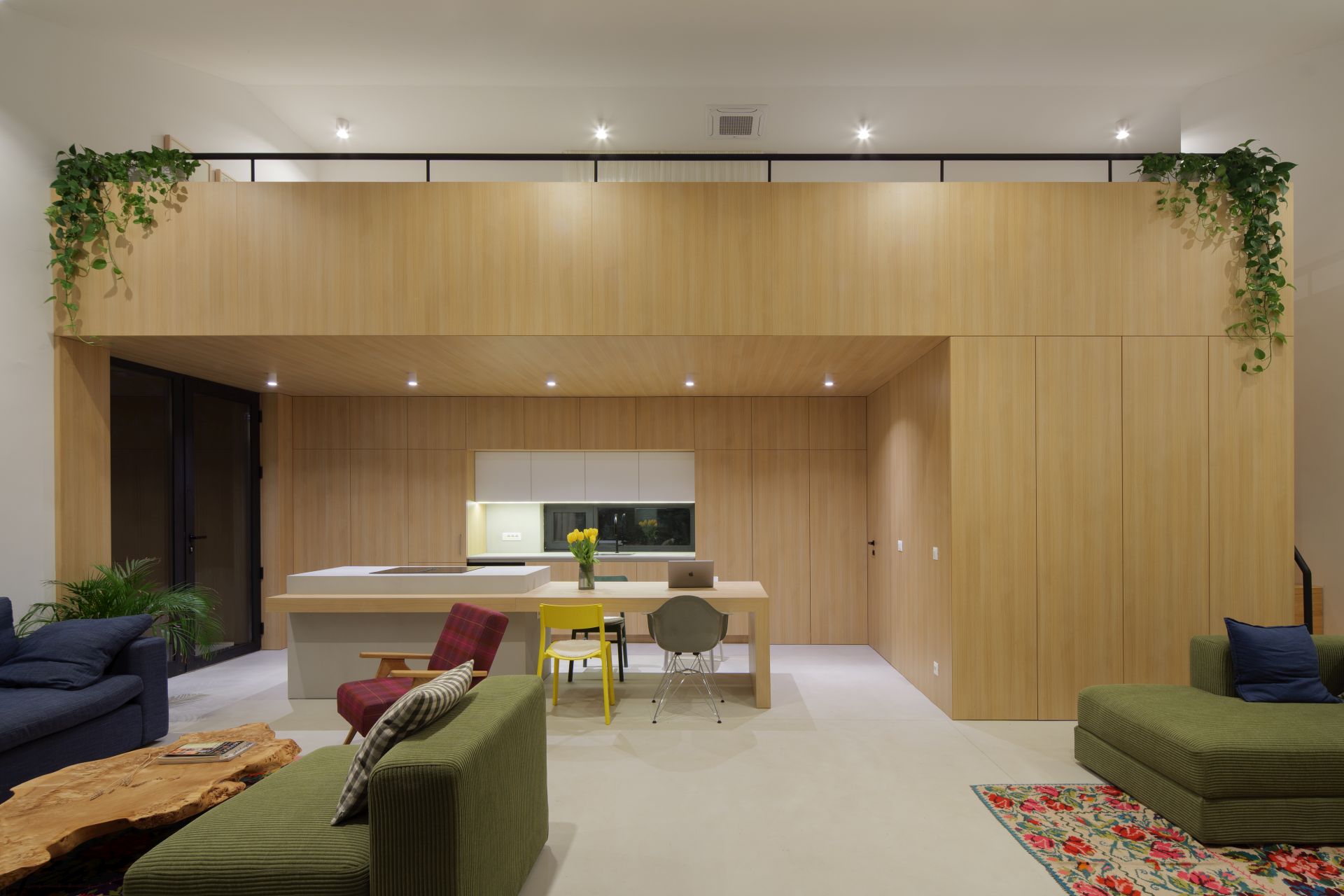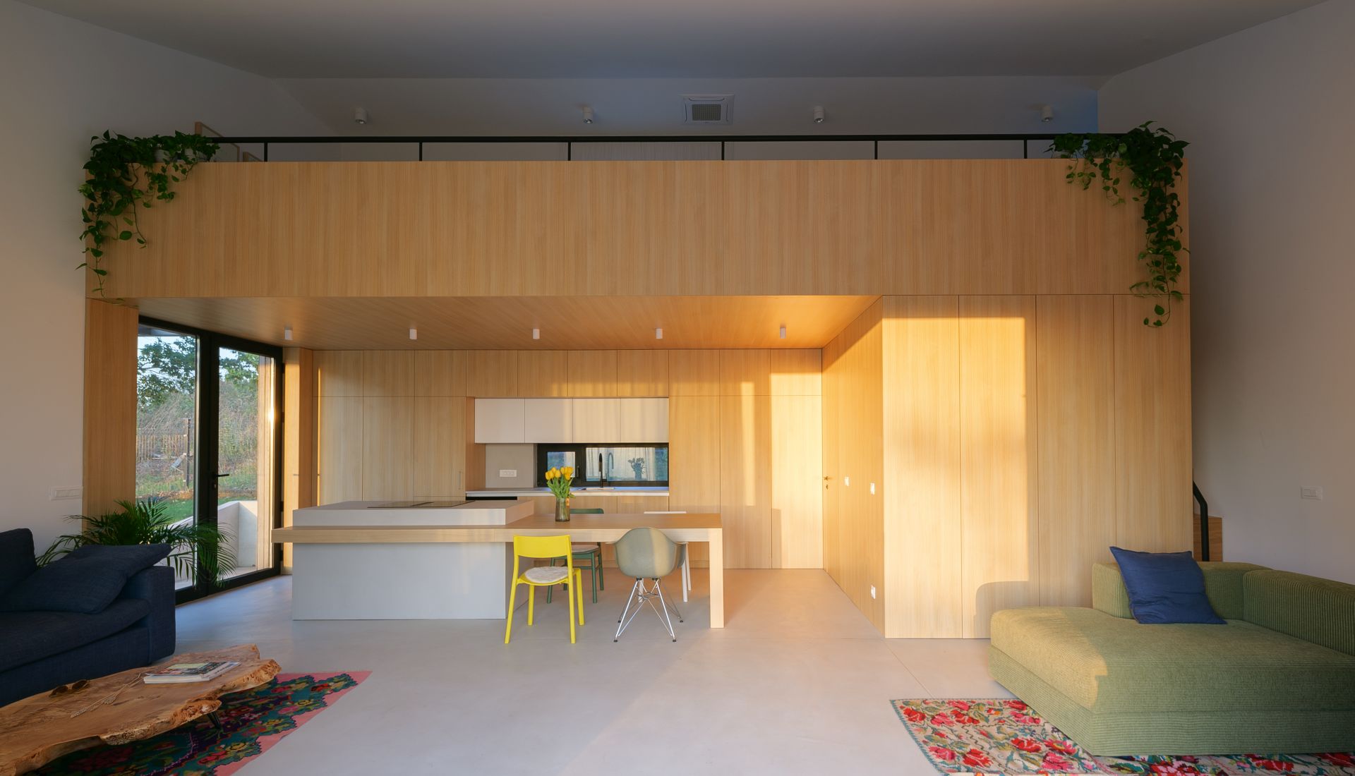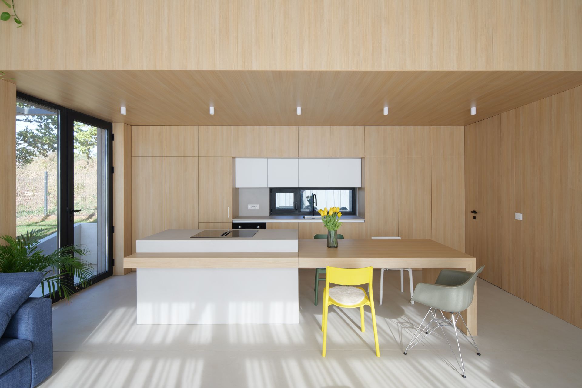 Kad je reč o unutrašnjosti objekta, umetnuta kompozicija od drveta u unutrašnji beli fasadni omotač je ključni element enterijera. Pult sa trpezarijom je njegov integrativni deo i centralni motiv kuće oko koga se odvija zivot.