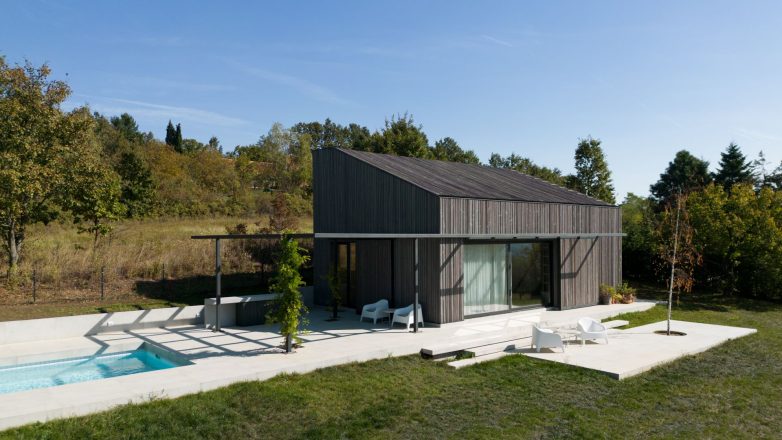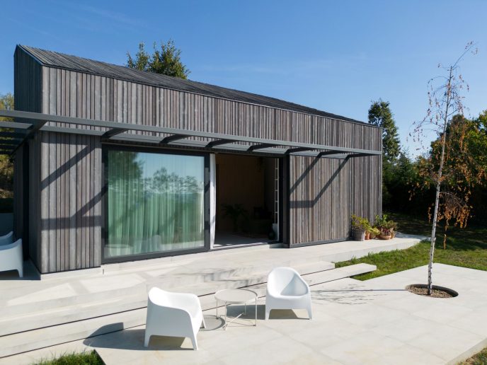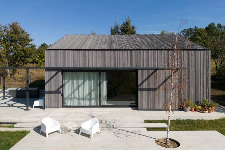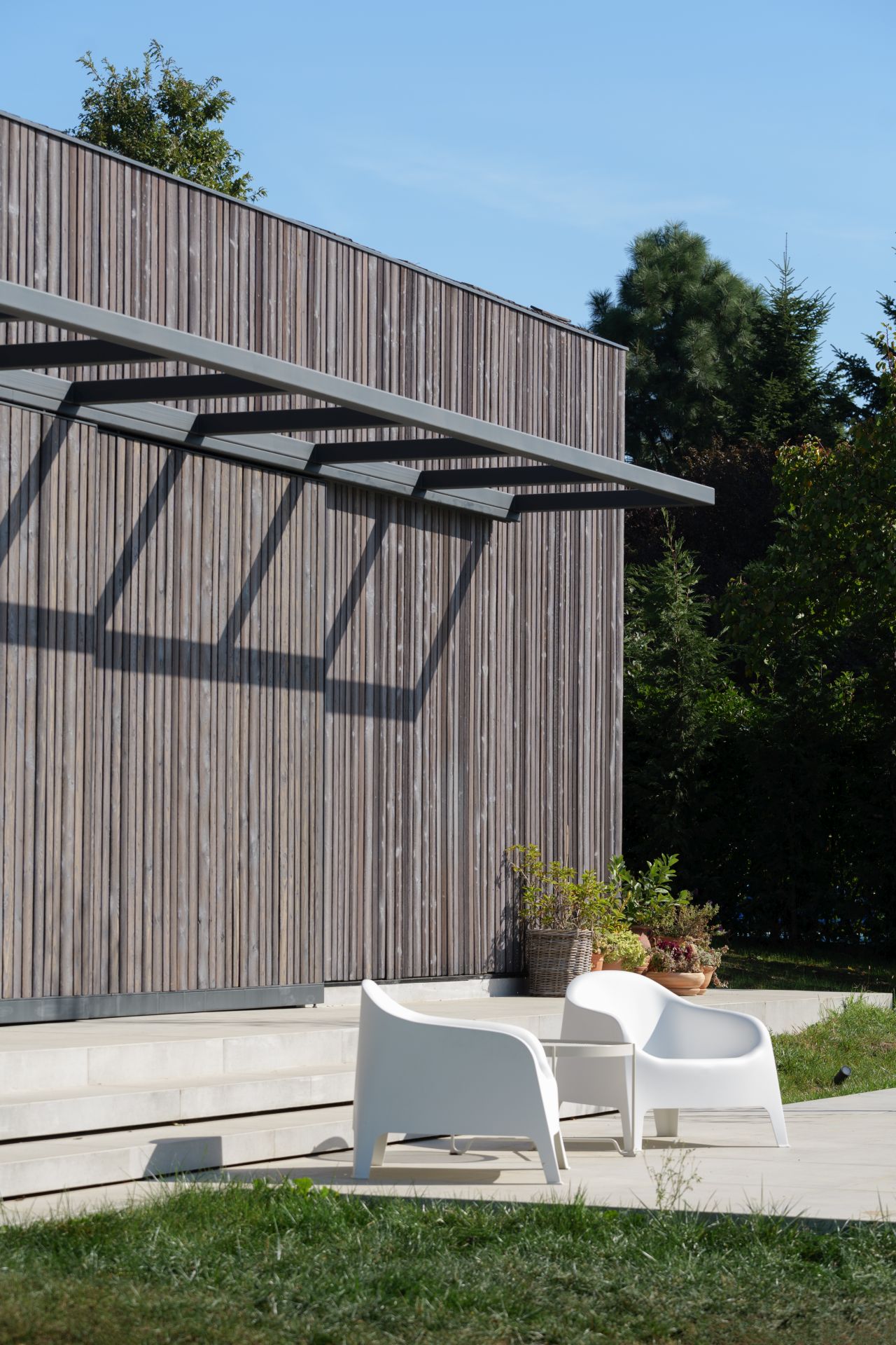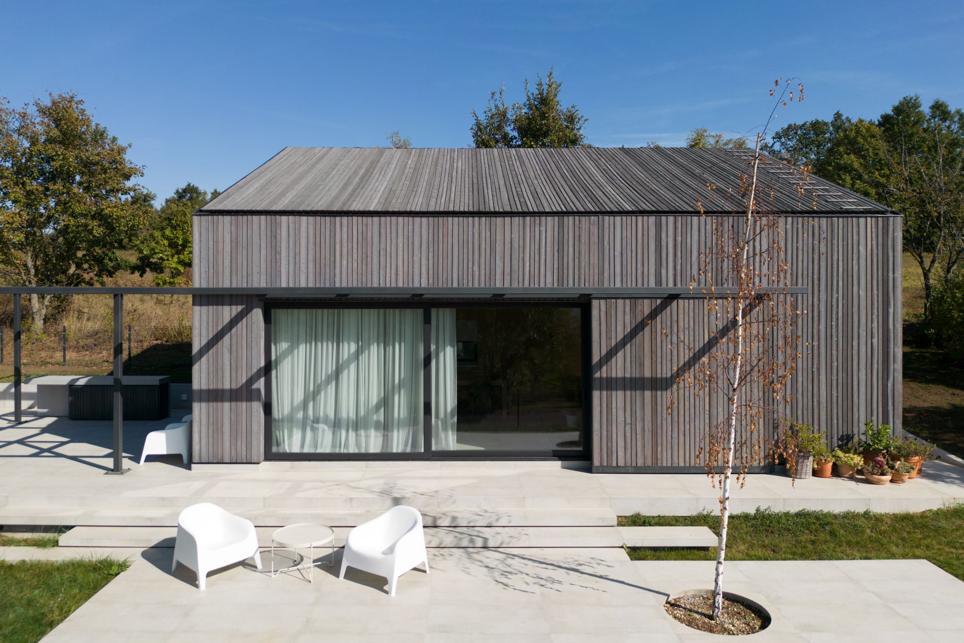 „Spoljašni omotač kuće je od prve ideje planiran da bude jednoobrazan, kako na fasadi, tako i na krovu. Izbor je pao na termotretirani ariš, ali tretiran starom japanskom tehnikom paljenja drveta. Ovom tehnikom drvo dobija dugogodišnju otpornost na vremenske uslove, a istovremeno je postignuta i željena ujednačena boja patine, što nam je delovalo kao najadekvatniji izbor“ – kaže autorka.