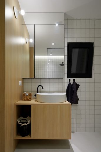 „Na samom ulazu, objedinjeno sa kompozicijom kuhinje, prvo se nalaze ulazni plakari, zatim ugradni delovi kuhinje, pa nakon kuhinjskih elemenata, opet ugradni plakari sve objedinjeno jednom kompaktnom drvenom kompozicijom do zida sa vratima za kupatilo, koja su takođe utopljena u drveni omotač“ – objašnjava autorka.