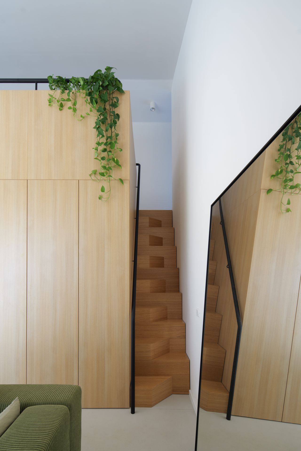 „Stepenište je projektovano u kontekstu redizajniranih „malo udobnijih merdevina“. Naizmenično podignuti kraci navode na sugestivno penjanje uzbrdo. Uklopljene u materijalizaciju enterijera, formirajući završetak ‘umetnute kompozicije’ od drveta u unutrašnji beli fasadni omotač“ – dodaje naša sagovornica.