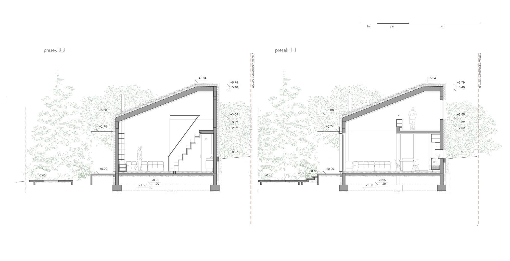 „Položaj parcele i orijentacija uslovila je na neki način i njeno oblikovanje. Polovina od tradicionalne kuće na dve vode asocijativno navodi na ideju da je kuća za odmor. Kosina krova prati pad terena, te se na taj način i u oblikovnom smislu utapa u teren“ – navodi naša sagovornica.