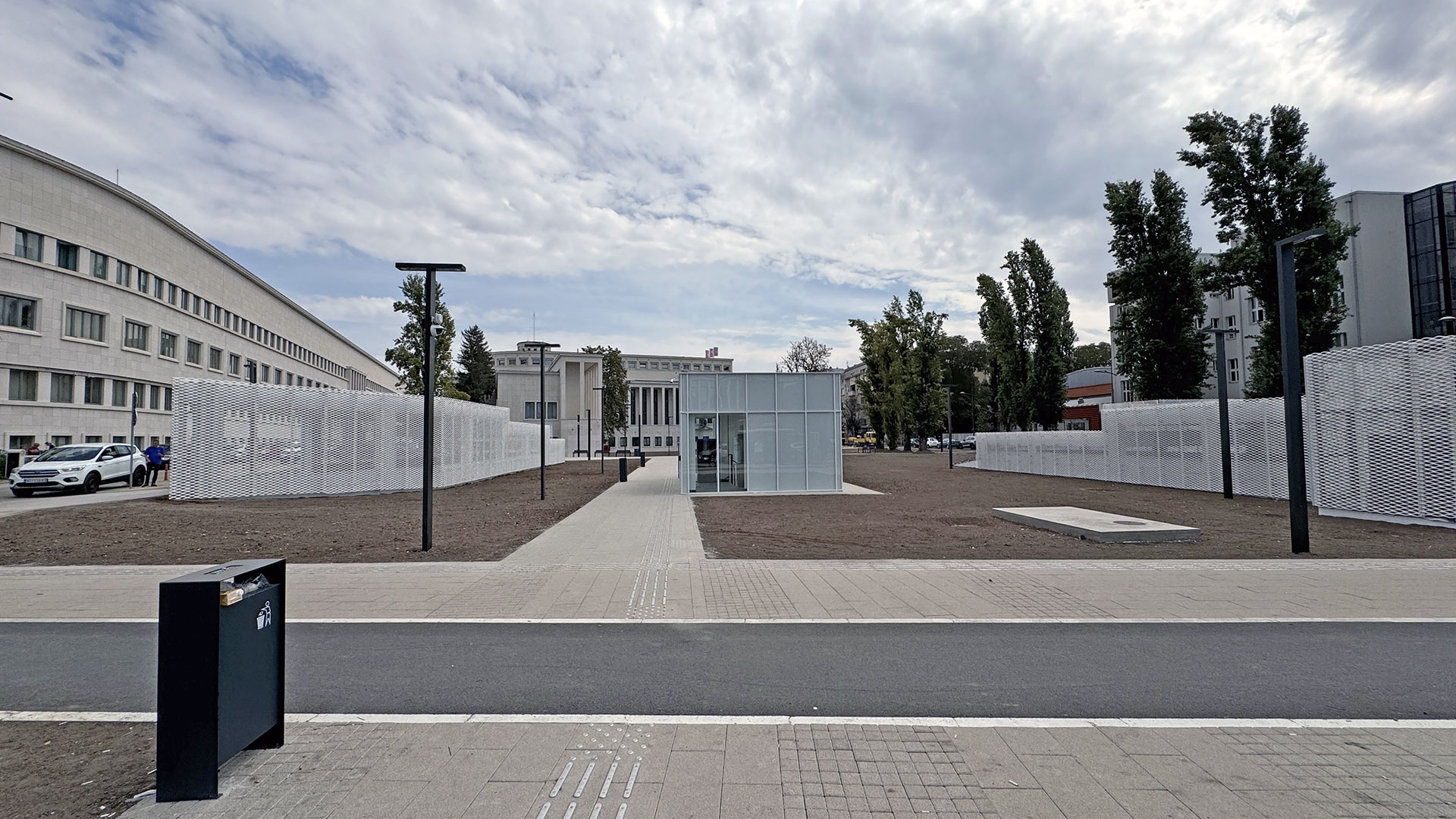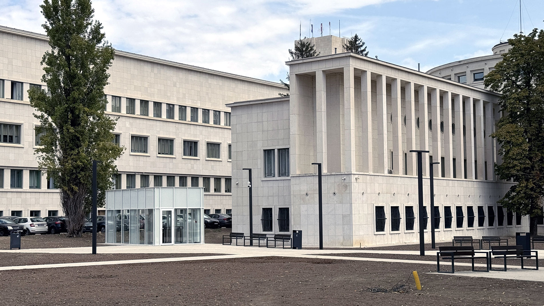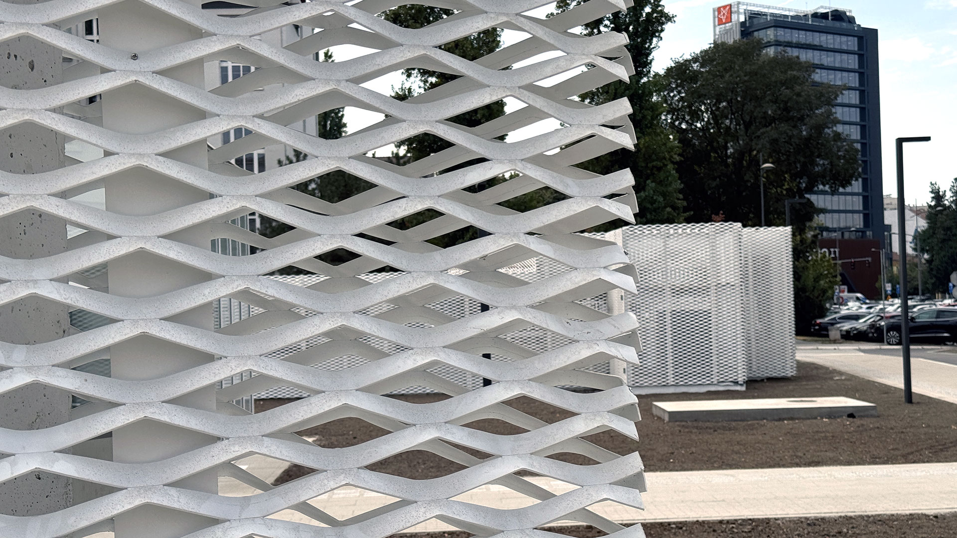 Međutim, na kraju je primenjen istegnuti lim za fasadu. Zbog bele boje lima, ove nadstrešnice su još dodatno istaknute pa vizuelno kontriraju zgradi Banovine. Bilo bi daleko bolje rešenje da je lim ofarban u antracit, tamno-sivu boju jer bi se time objekti koloritno utopili u okruženje.