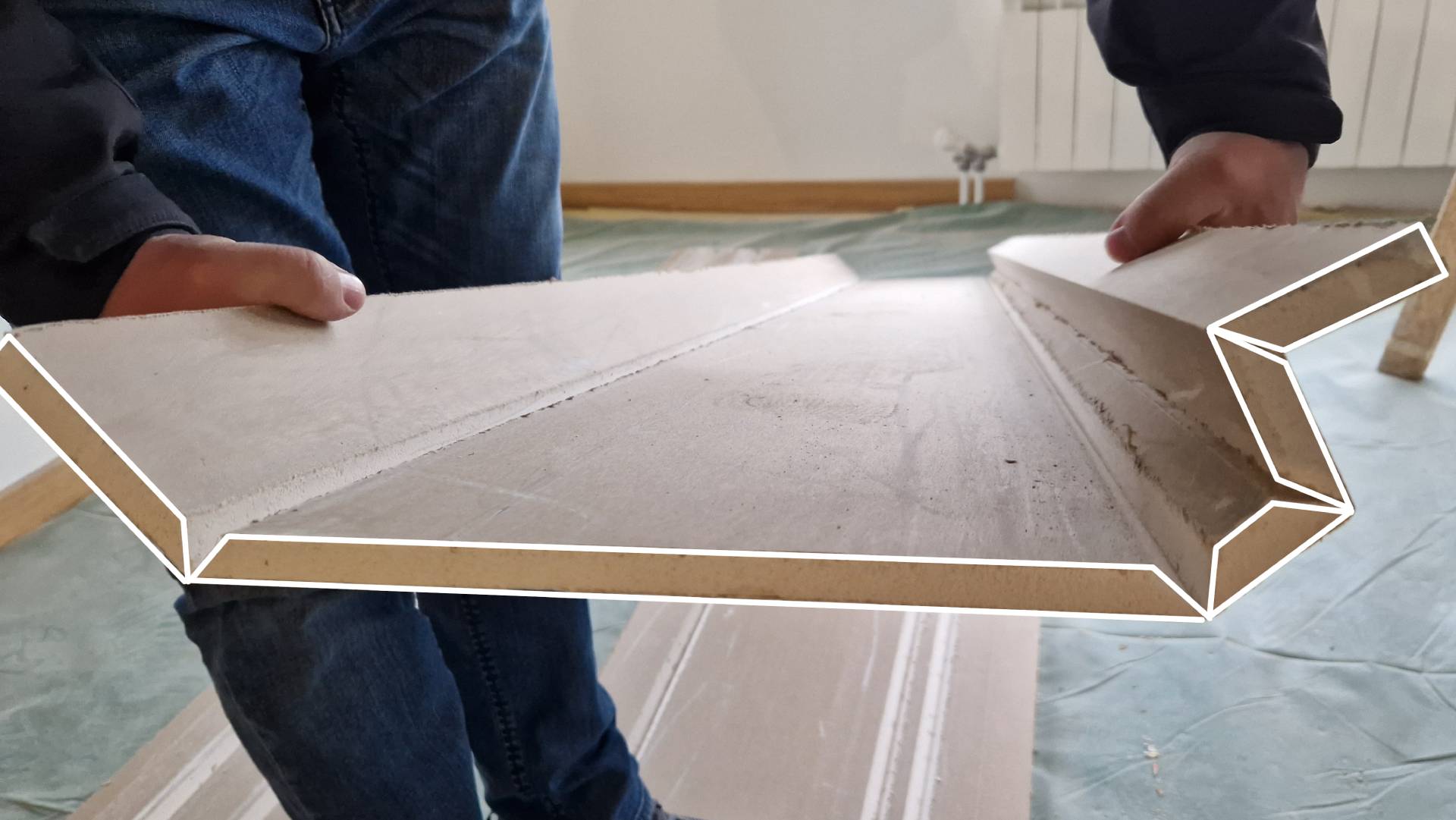 Nakon što se gipsana ploča iseče glodalicom i savije u željeni oblik, kanali se namažu podlogom i zapune se pur penom. Nakon toga se kače na konstrukciju plafona.