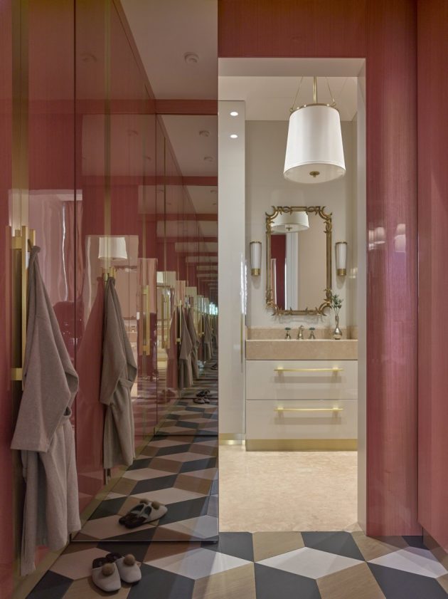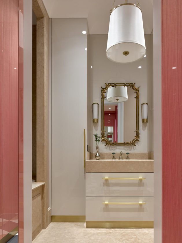Glamurozno kupatilo sa svojim hrabrim pink ormarićima i art nouveau zlatnim ogledalom daju prostoru fanki izgled.