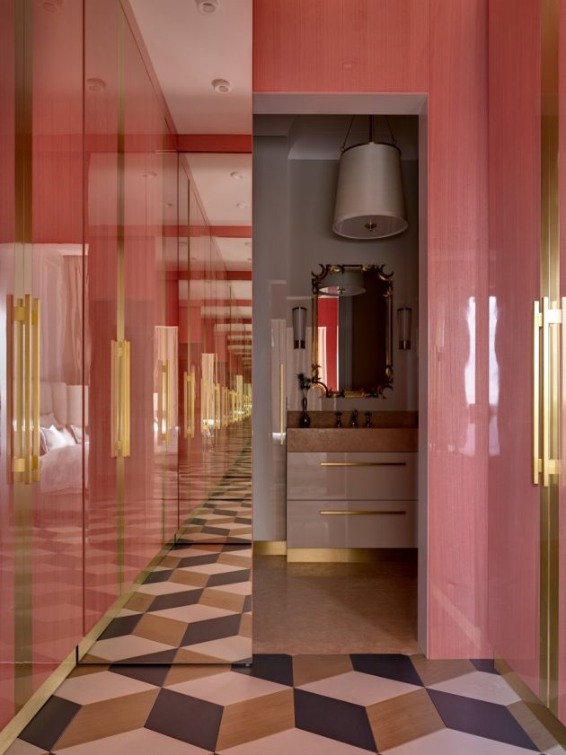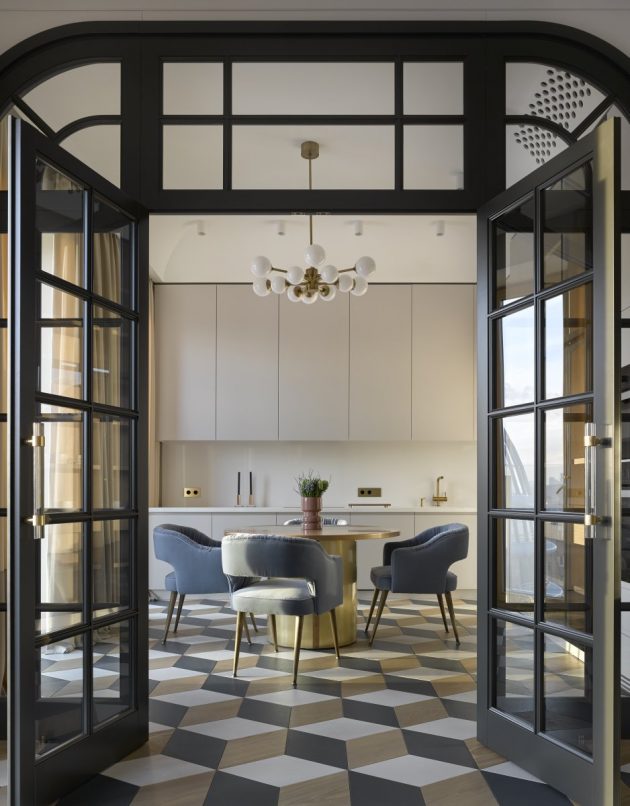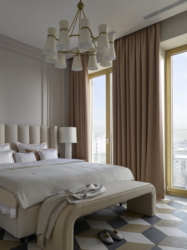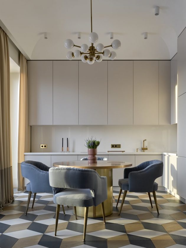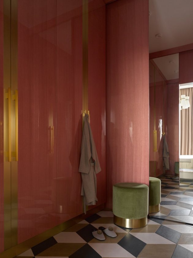Poznata ruska dizajnerka imala je odrešene ruke u opremanju ovog prostranog stana u centru Moskve. Za mladi bračni par sa detetom, Lašmanova je osmislila enterijer s jakim vizuelnim kontrastima, smelim kombinacijama boja i luksuznim komadima nameštaja i detaljima zahvaljujući kojima ceo prostor deluje raskošno i toplo.