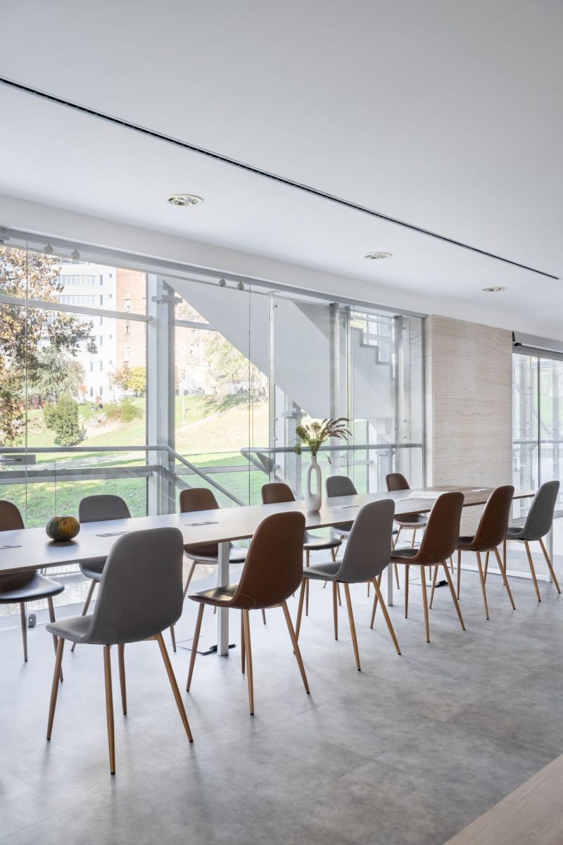 Staklene pregrade u salama za sastanke u potpunosti otvaraju pogled na coworking i pogled sa prozora – trg sa drvećem i brdovitim terenom.
