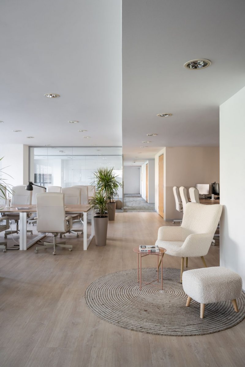 Stolovi sa drvenim pločama i bež radne stolice stvaraju osećaj čistoće i udobnosti.