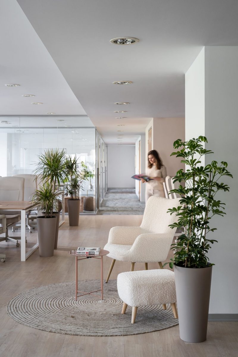 Projekat je koristio tri glavne boje brenda: pistacija, losos i bež. Tri tehnička bloka u kancelariji obojena su svaki u svoju boju sa horizontalnom podelom od dve nijanse – tamnije i svetlije.