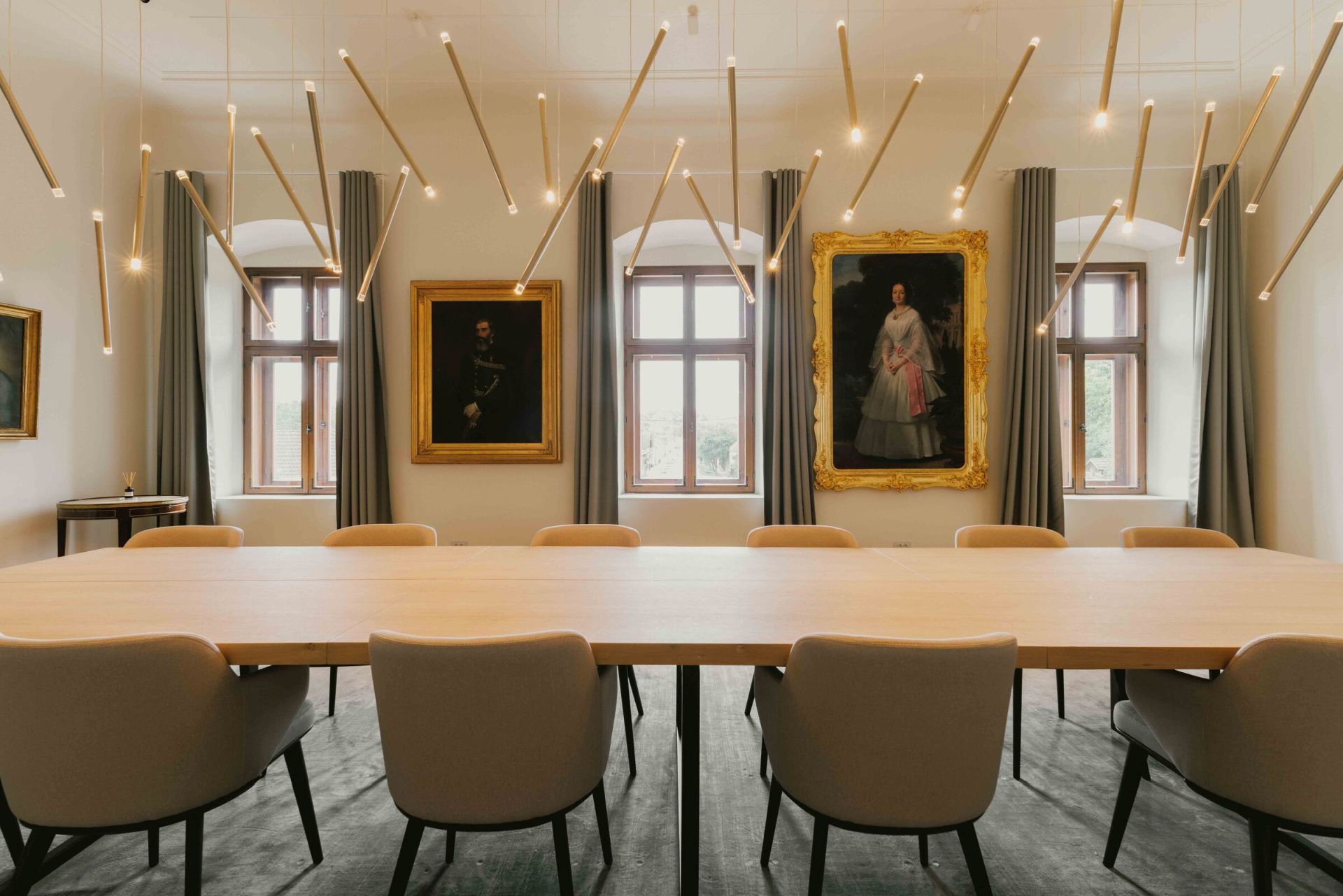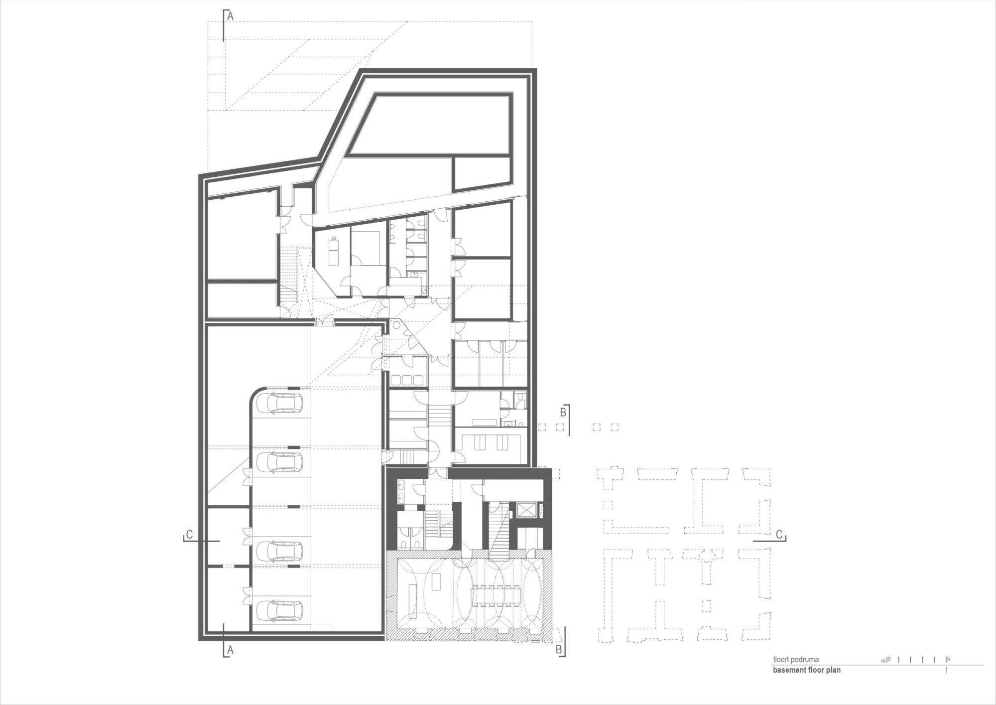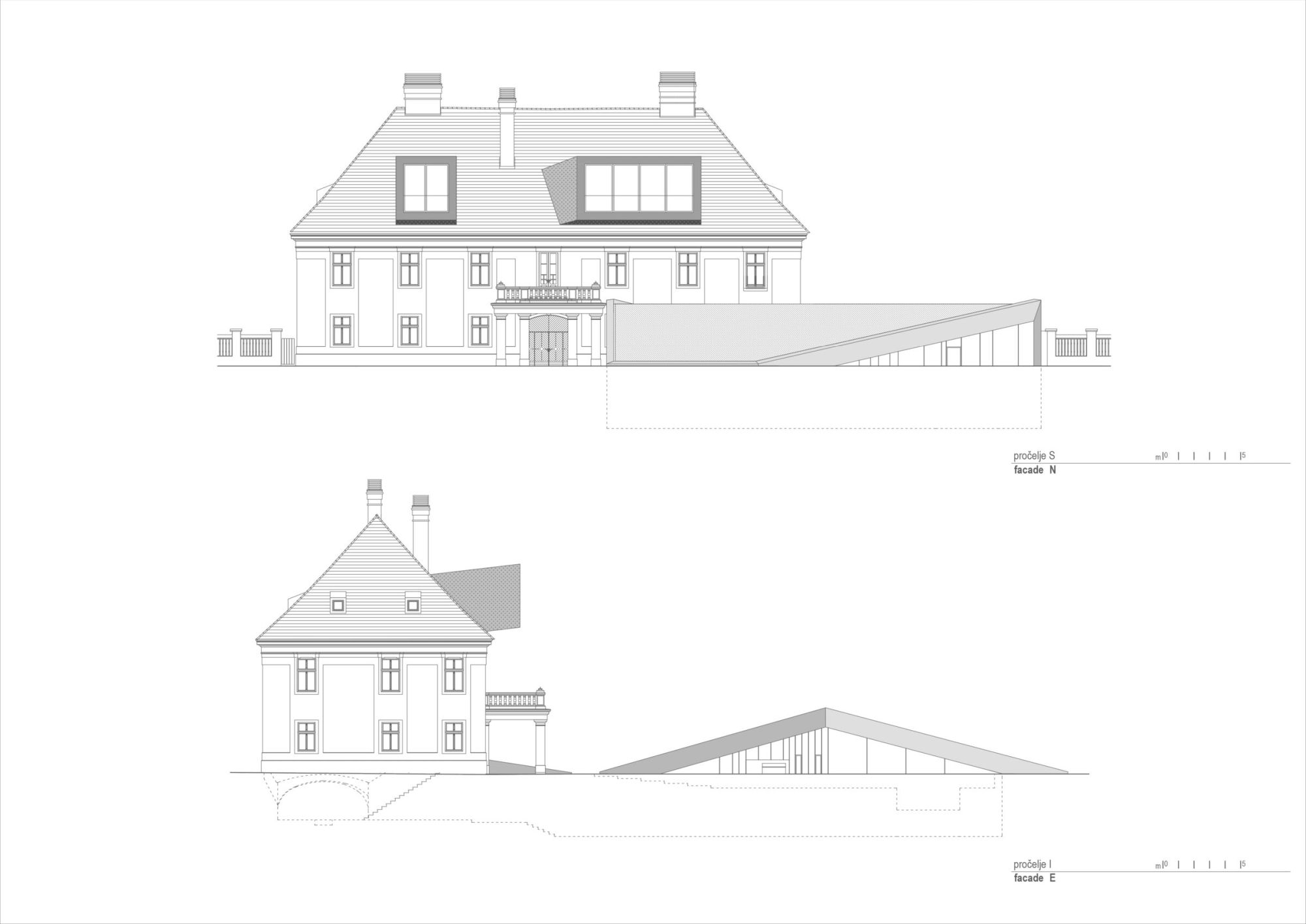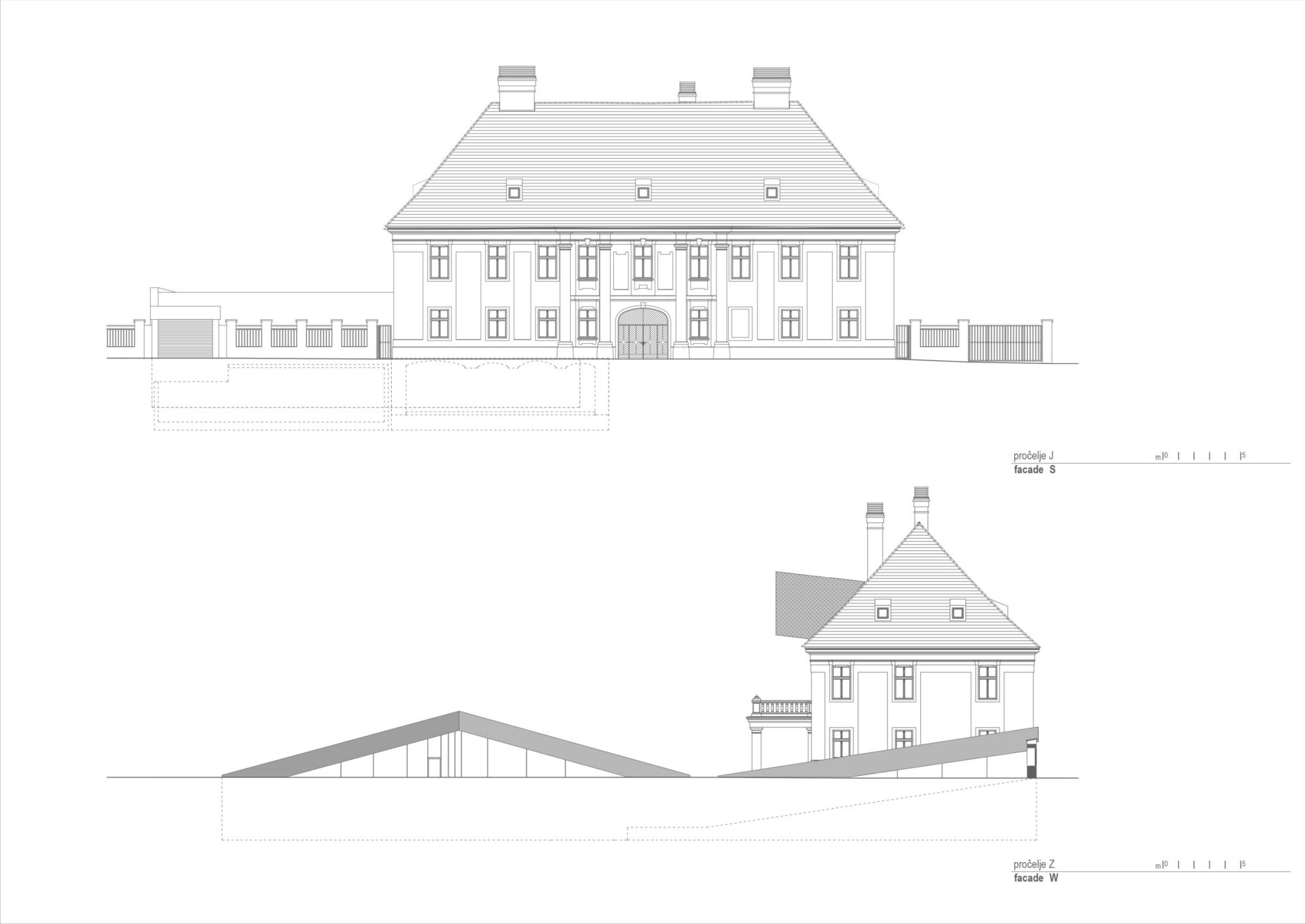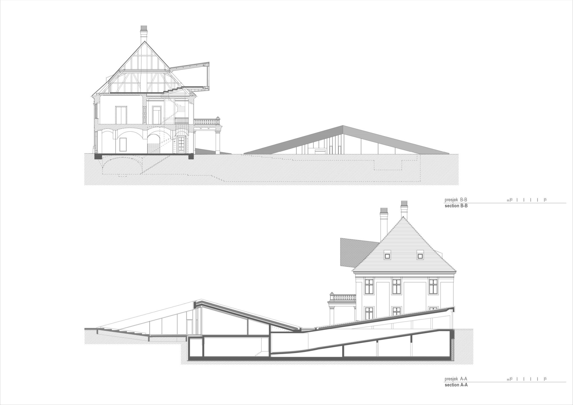 Određeni deo funkcija smešten je u okviru istorijske zgrade, dok su podzemna garaža, usluge i wellness sa bazenom smešteni u zadnjem delu dvorca, ispod travnate površine istorijskog parka, koji svojim odizanjem u bazenskoj zoni nagoveštava dinamiku novih funkcija.
