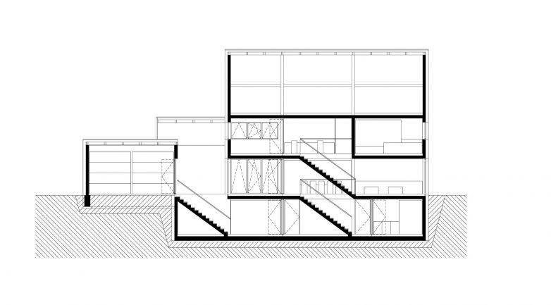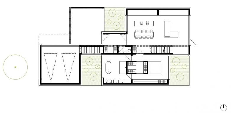 U prazninama između pojedinačnih kubusa, kuća stvara atrijume i terase koje služe kao zelene tampon-zone između enterijera i eksterijera i istovremeno obezbeđuju dodatno osvetljenje prostorija.