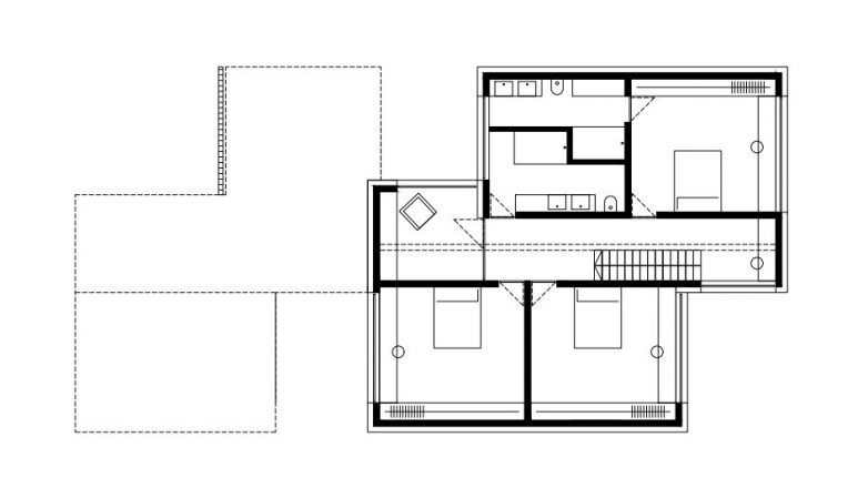 U prizemlju su smešteni dnevni i trpezarijski zajednički prostori porodice, dok se na spratu nalaze privatne prostorije i spavaće sobe .