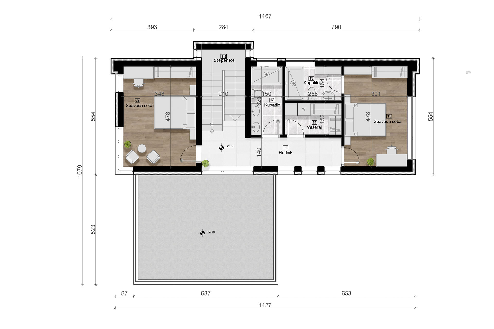 Što se tiče sadržaja, u prizemlju se nalaze WC, dnevni boravak, kuhinja sa trpezarijom, ostava, garaža sa tehničkom prostorijom i radna soba koja lako može biti pretvorena u spavaću. Na spratu imamo dve spavaće sobe, dva kupatila, hol i vešeraj.