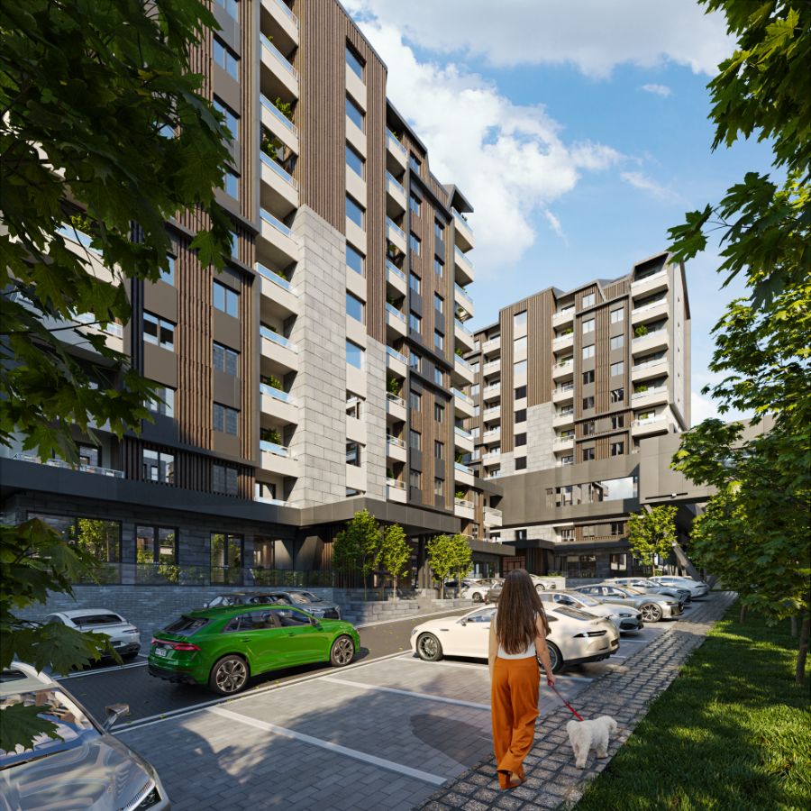 Vizuelizacije ukazuju na gust raspored objekata unutar kompleksa, pri čemu je hotelska zgrada okružena visokim rezidencijalnim blokovima.