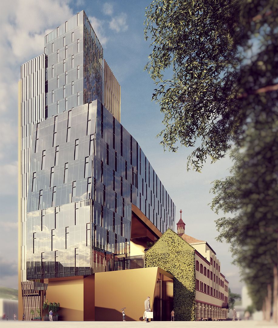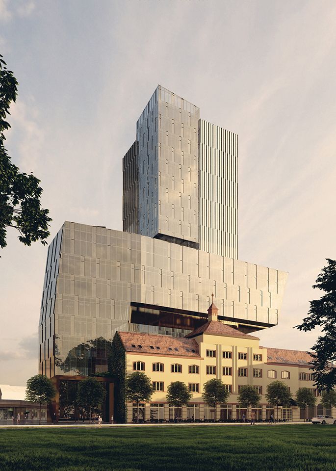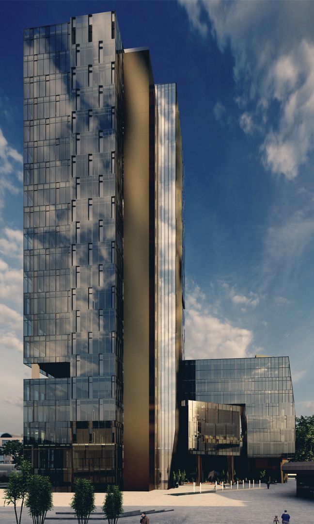 Centralni deo budućeg kompleksa predstavlja kula od 22 sprata, visoka 101 metar, koja će predstavljati novi vertikalni reper Trga Krajine, dok će horizontalne ostakljene forme iznad postojećeg hotela simbolizovati spoj starog i novog.