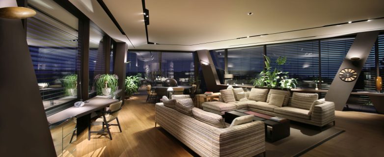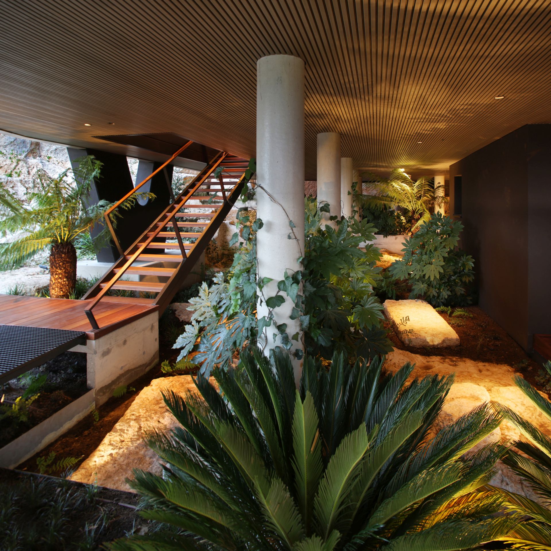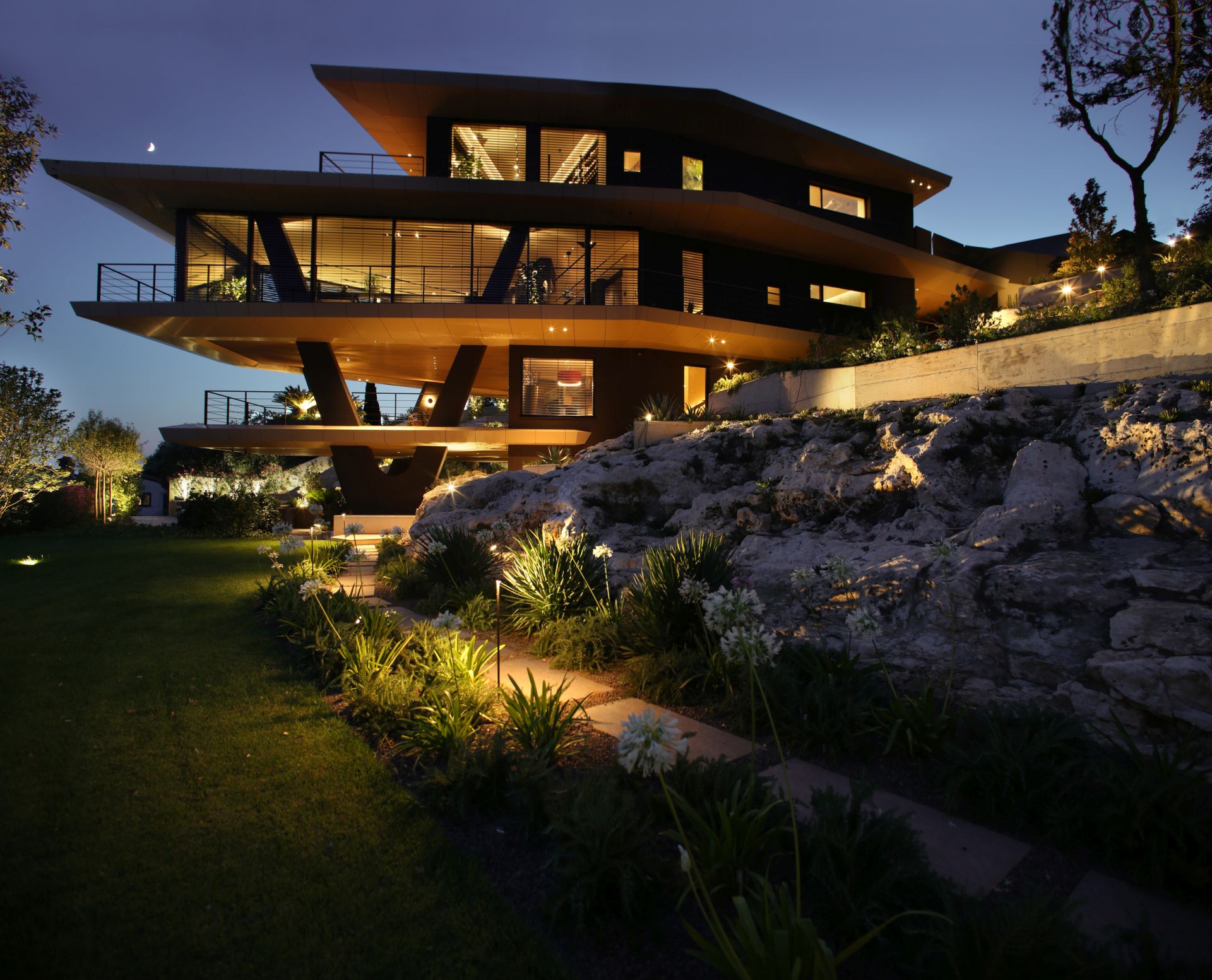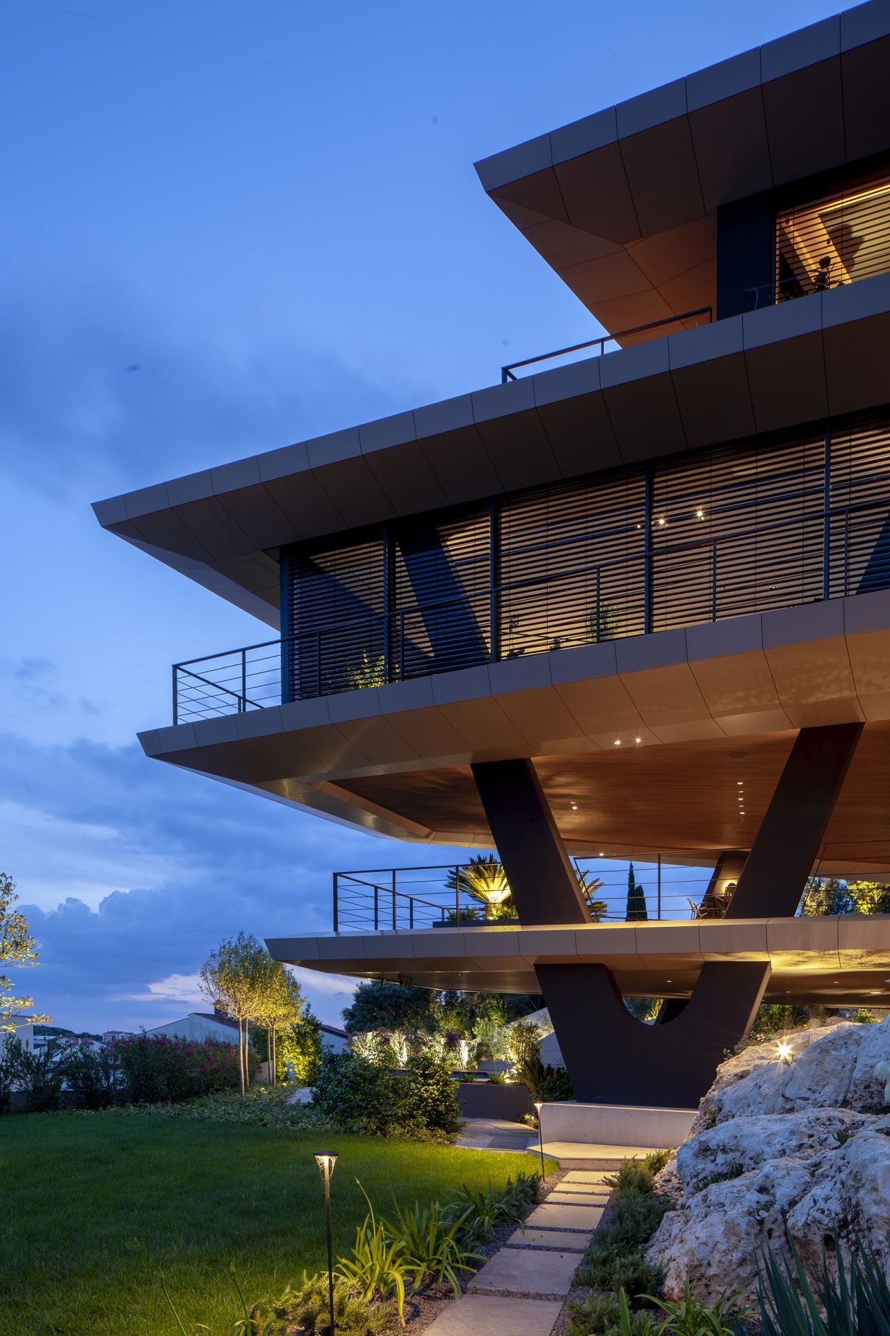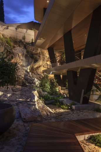 Rasveta, koju potpisuje Dean Skira, dodatno naglašava arhitektonske geste i prirodni ambijent. Noću, objekat poprima gotovo skulpturalni karakter – lebdeći volumeni, istaknuti stubovi i arheološki sloj u prizemlju povezuju se u jedinstvenu prostornu kompoziciju.