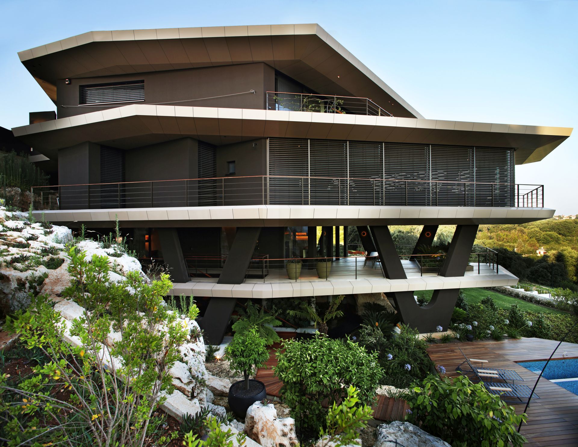 Arhitekte Dean Skira i Leonid Zuban osmislili su kuću koja lebdi na V-stubovima, čuvajući rimski kamenolom i pretvarajući ga u deo svakodnevnog života.
