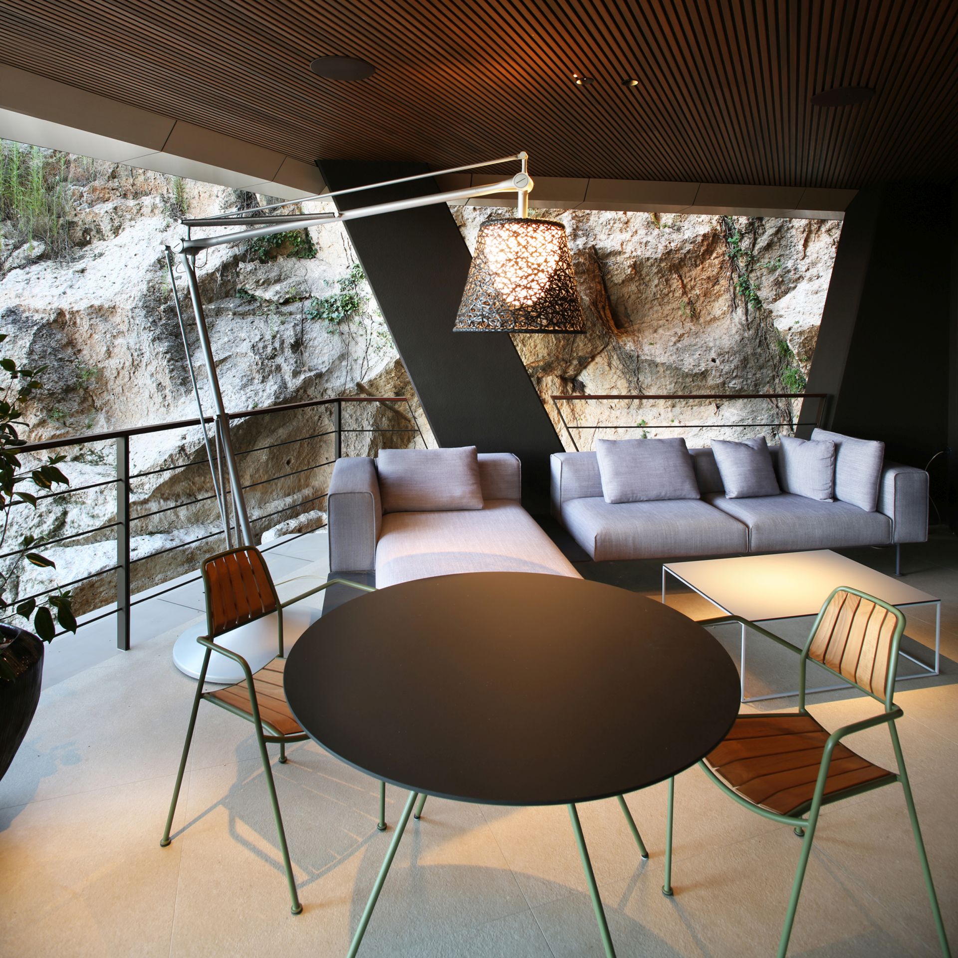 Rasveta, koju potpisuje Dean Skira, dodatno naglašava arhitektonske geste i prirodni ambijent. Noću, objekat poprima gotovo skulpturalni karakter – lebdeći volumeni, istaknuti stubovi i arheološki sloj u prizemlju povezuju se u jedinstvenu prostornu kompoziciju.