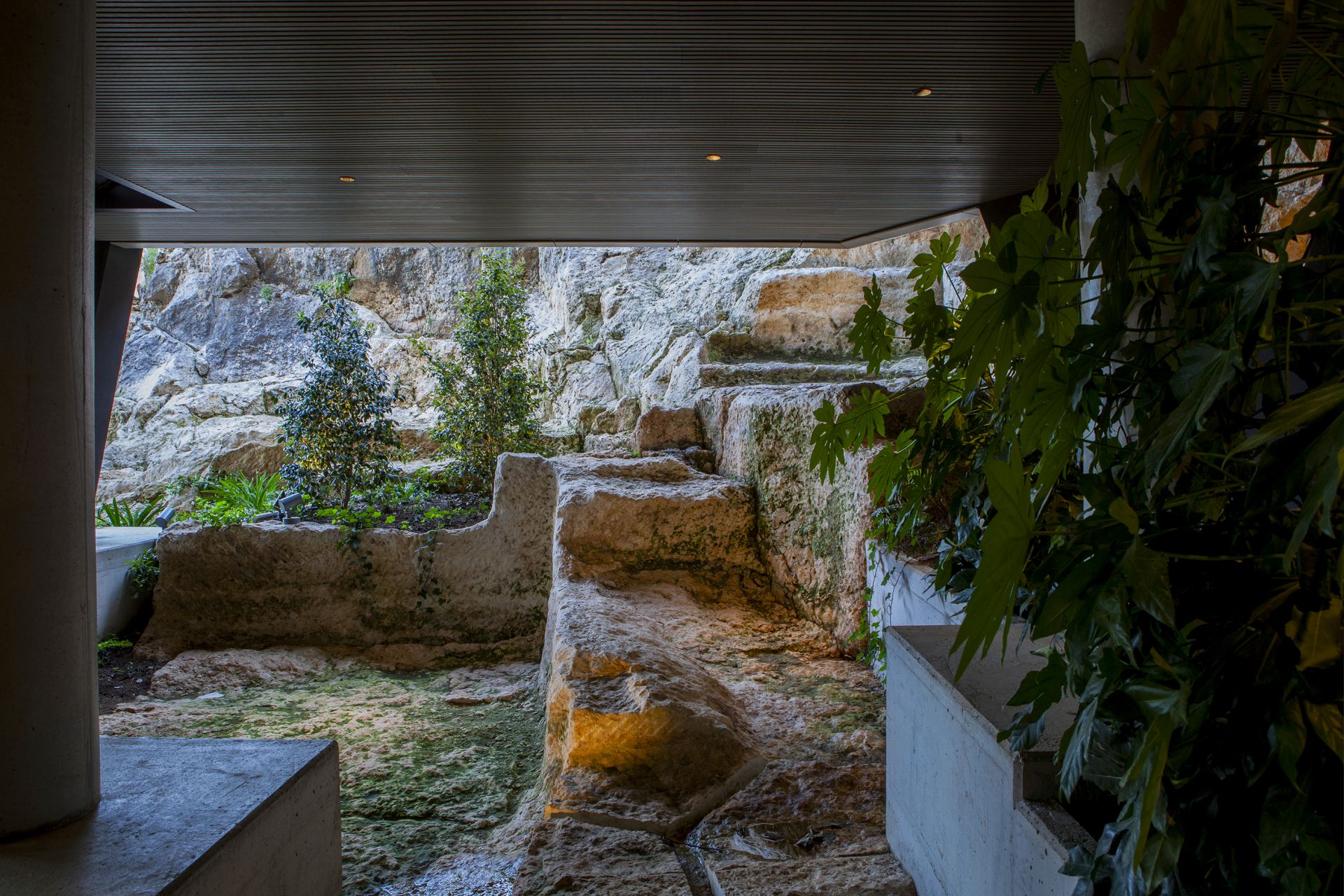 Kući se pristupa sa gornje etaže, budući da teren denivelacijom nalaže ulazak s najviše tačke parcele. Potom se kroz unutrašnji prostor korisnici postepeno spuštaju do terasa i vrtova, da bi na kraju stigli do arheološkog jezgra – kamenoloma.