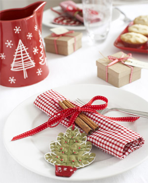 Veoma zanimljiv detalj na stolu su i male jelke izrađene od šišarki koje vidite na slici. Korišćenje posuđa sa novogodišnjim motivima može biti interesantno ali pazite da ne preterate jer lako možete zaći u kič.