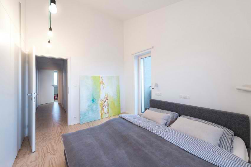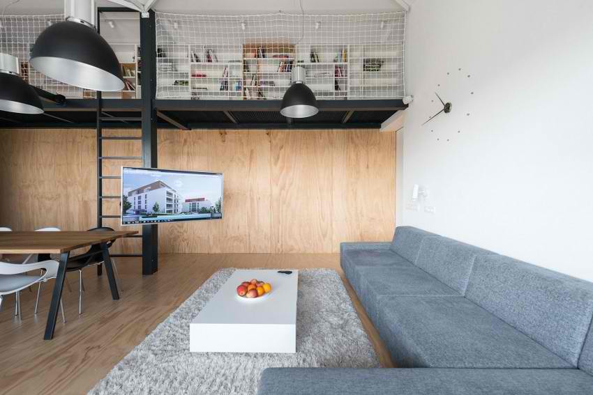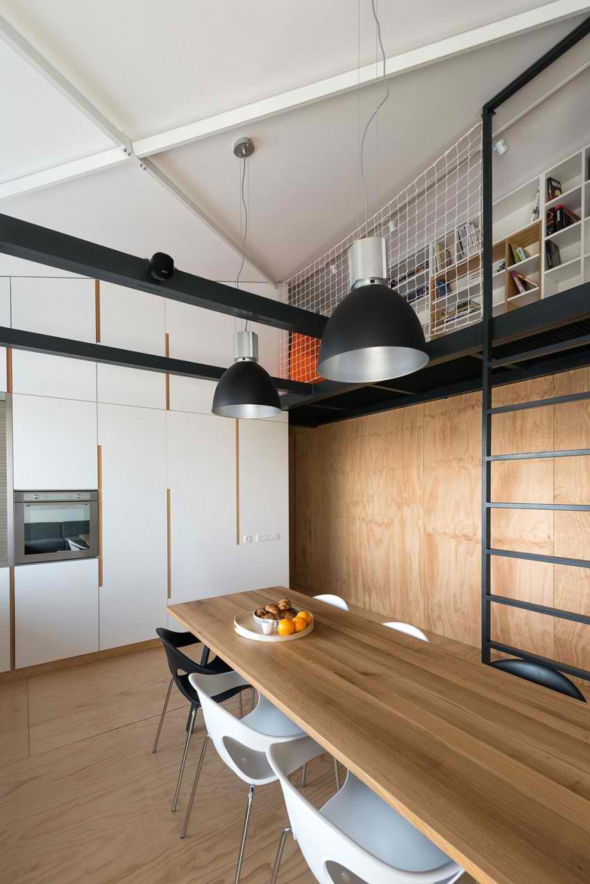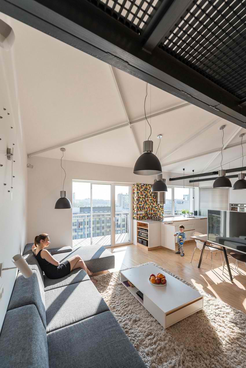 Da tekstura drveta odlično ide sa crno-belom kombinacijom još jedanput dokazuje ovaj enterijer potkrovlja u užem centru prestonice Slovačke. Elementi koji su u direktnom vizuelnom kontaktu sa stanarima (pod i zid naspram prozora) napravljeni su od borovine, dok su ostali zidovi, tavanica i nameštaj po meri urađeni u beloj boji. U ovakvo postavljenom prostoru, crna konstrukcija galerije savršeno se uklopila.