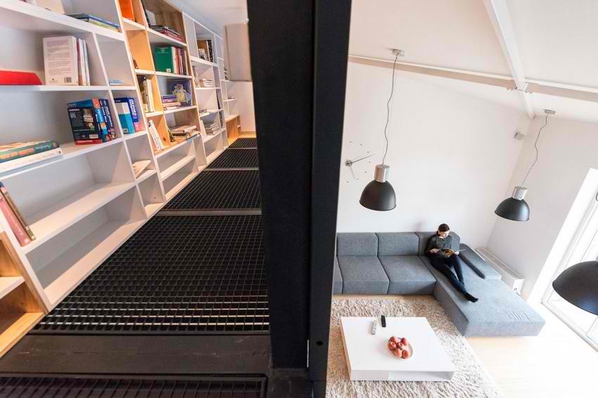 Pošto je dnevna soba visine oko četiri metra, arhitekte su rešile da bi najbolje bilo da se ovaj prostor podeli na dva dela. Tako je nastala galerija, odnosno, mezazin koji je opremljen brojnim policama za knjige kao i stolicama za uživanje u čitanju. Konstukcija je napravljena od čeličnih profila preko kojih su postavljena gazišta od čelične mreže koja zbog svoje strukture vizuelno ne smanjuje prostor.