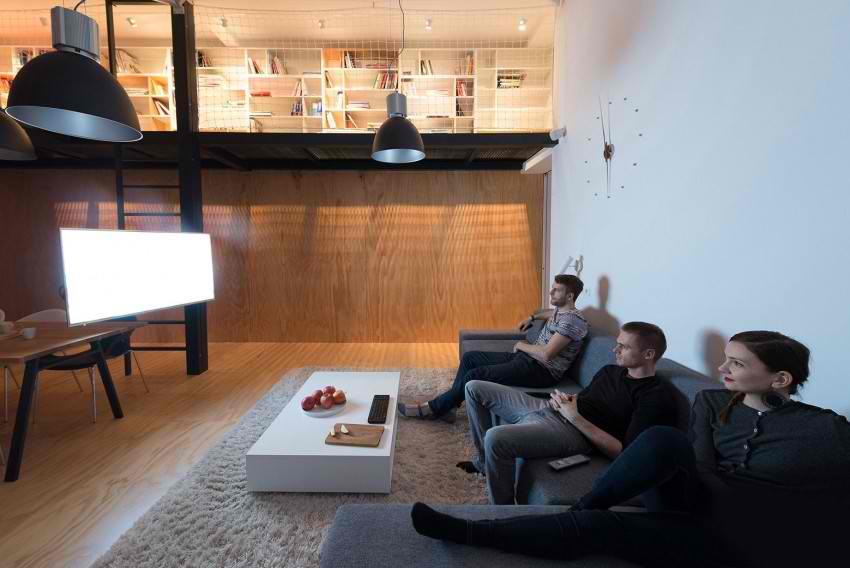 U donjem delu je dnevni boravak sa udobnom sofom i televizorom okačenim od pokretni nosač.