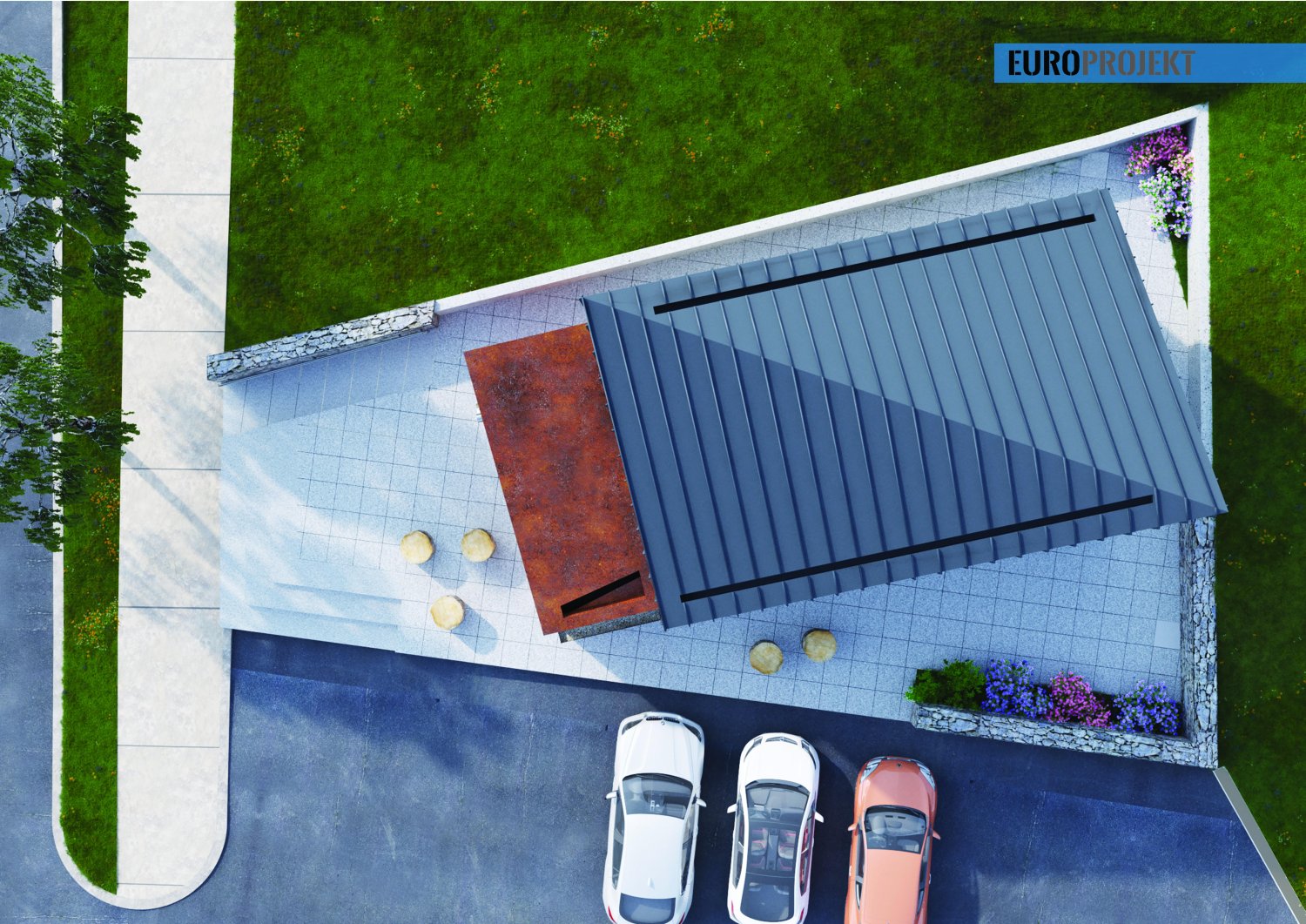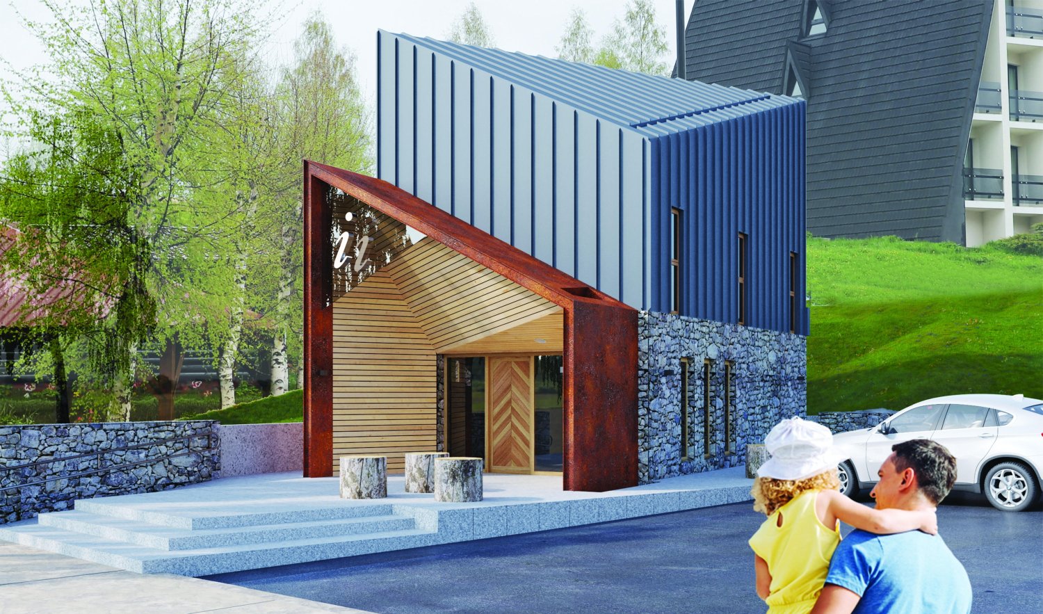 Na prizemnom delu objekta primenjen je prirodni autohtoni kamen, dok su sprat i krov pokriveni falcovanim limom.