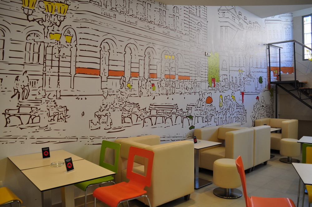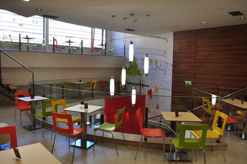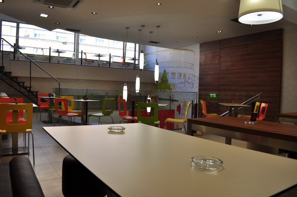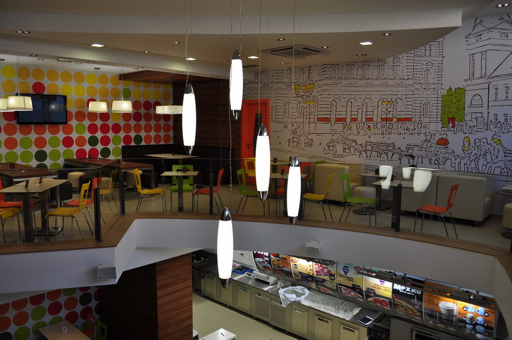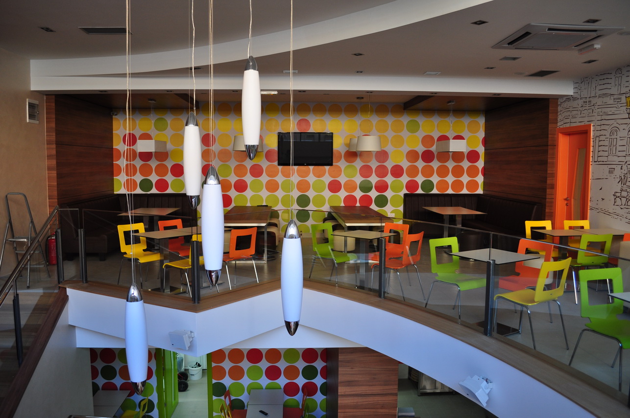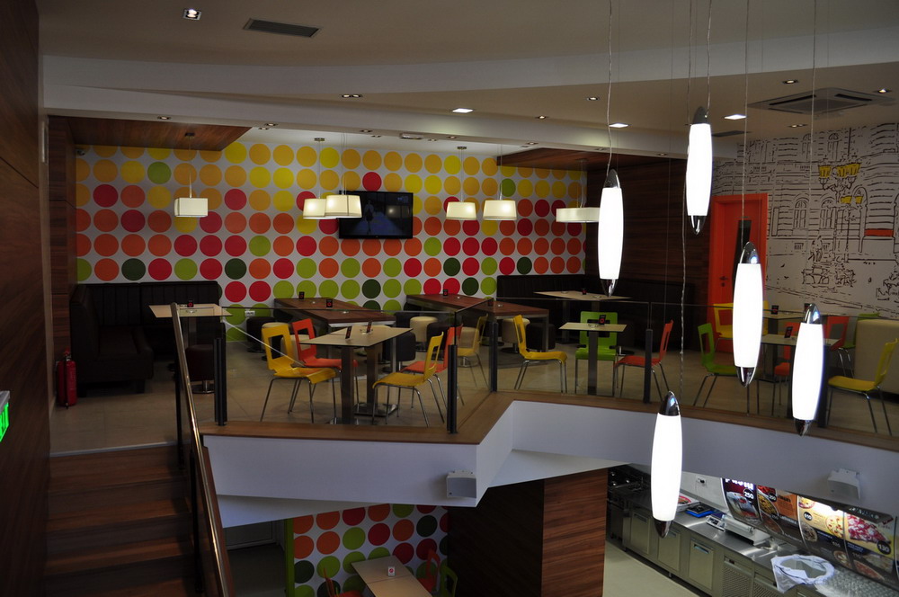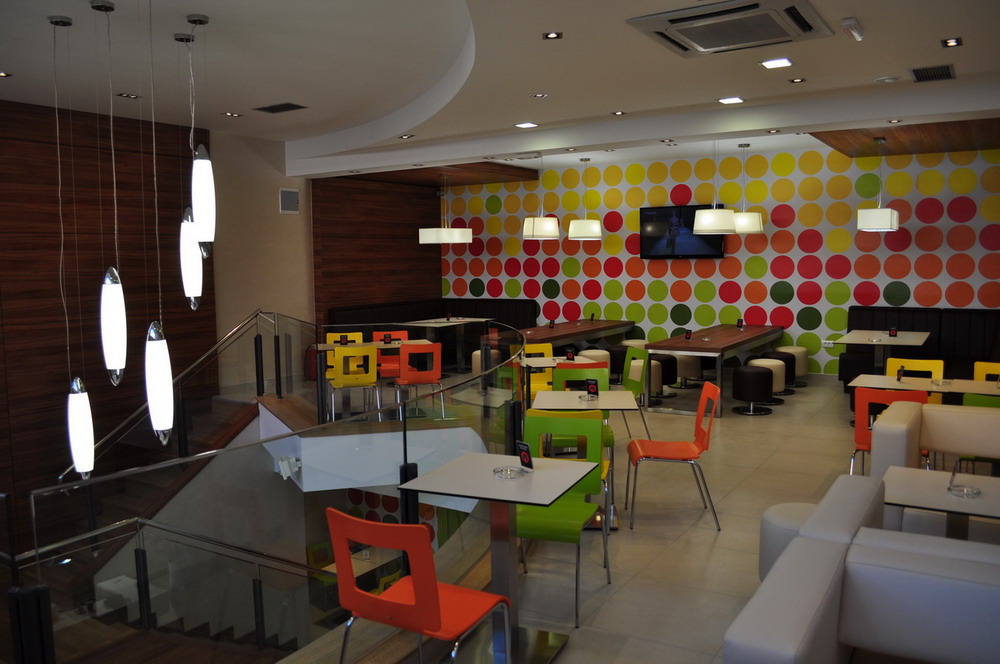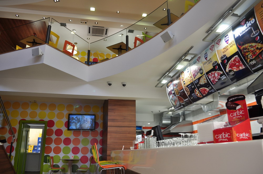 Prostor nekadašnjeg kafića potpuno je renoviran i adaptiran u skladu sa novom namenom. Caribic Fast Food je restoran brze hrane na tri nivoa. U prizememlju se, na očigled kupaca, pravi i izdaje hrana dok su preostala dva nivoa namenjena za konzumiranje. Kombinacijom kožnih separea, dugačkih drvenih stolova sa klupama i stolovima sa plastičnim stolicama vedrih boja postignuto je interesantno enterijersko rešenje koje otvara apetit.