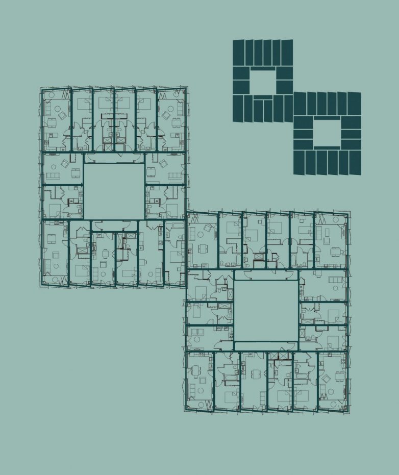 Svaka etaža ovog stambenog objekta sadrži po sedam stambenih jedinica po kuli, čije se površine i organizacije kreću od jednosobnog do trosobnog stana. Sve stanove karakteriše koncept otvorenog plana, kao i prozori od poda do plafona i francuski balkoni.