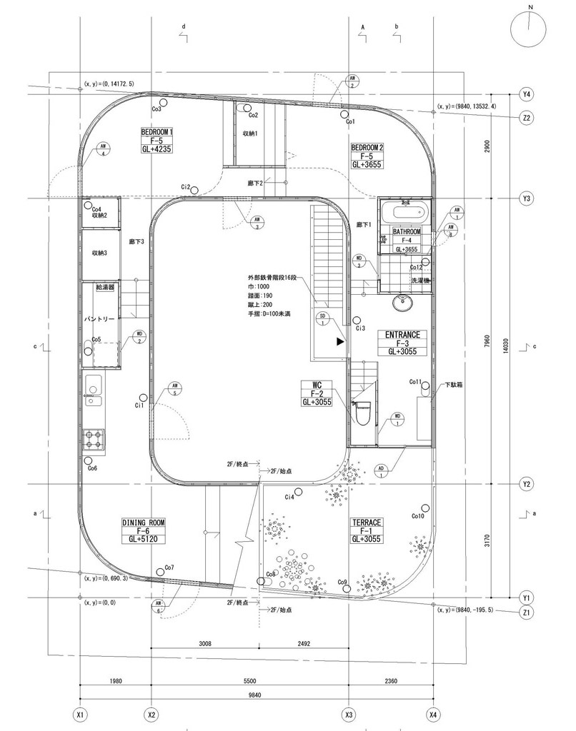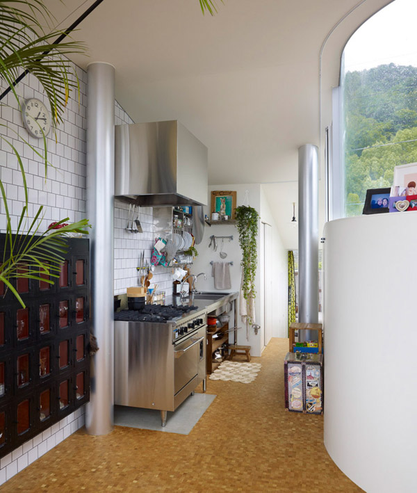 Konstrukcija kuće se sastoji od betonske ploče zaobljenih ivica kroz koju je prodire spiralno stepenište.