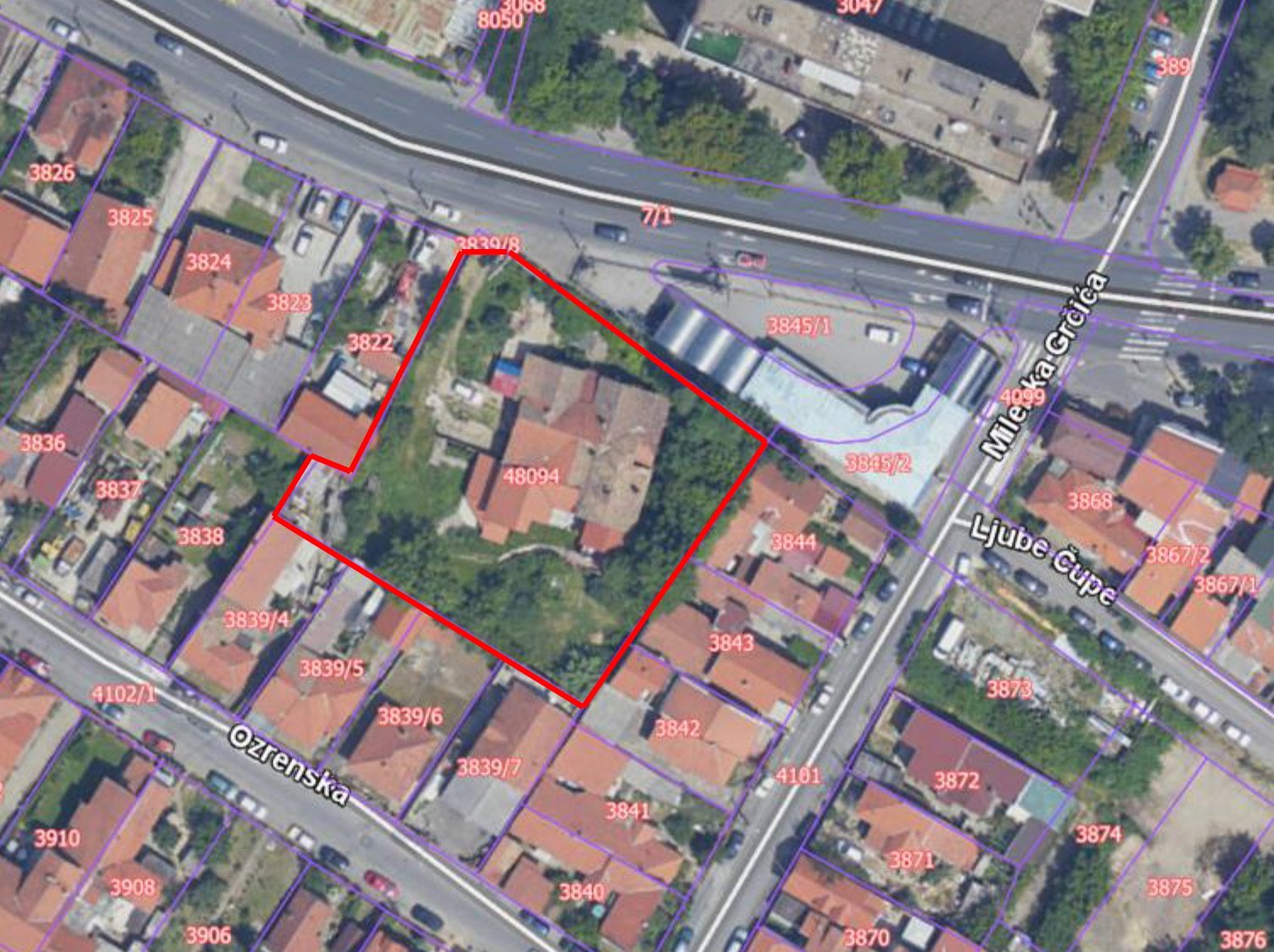 Predmetna parcela nepravilnog je poligonalnog oblika površine 2.039 m2, a oslanja se na ulicu Ustaničku u delu planirane okretnice i raskrsnice sa ulicom Milenka Grčića. Na parceli je izgrađen prizemni objekat sa suterenom.