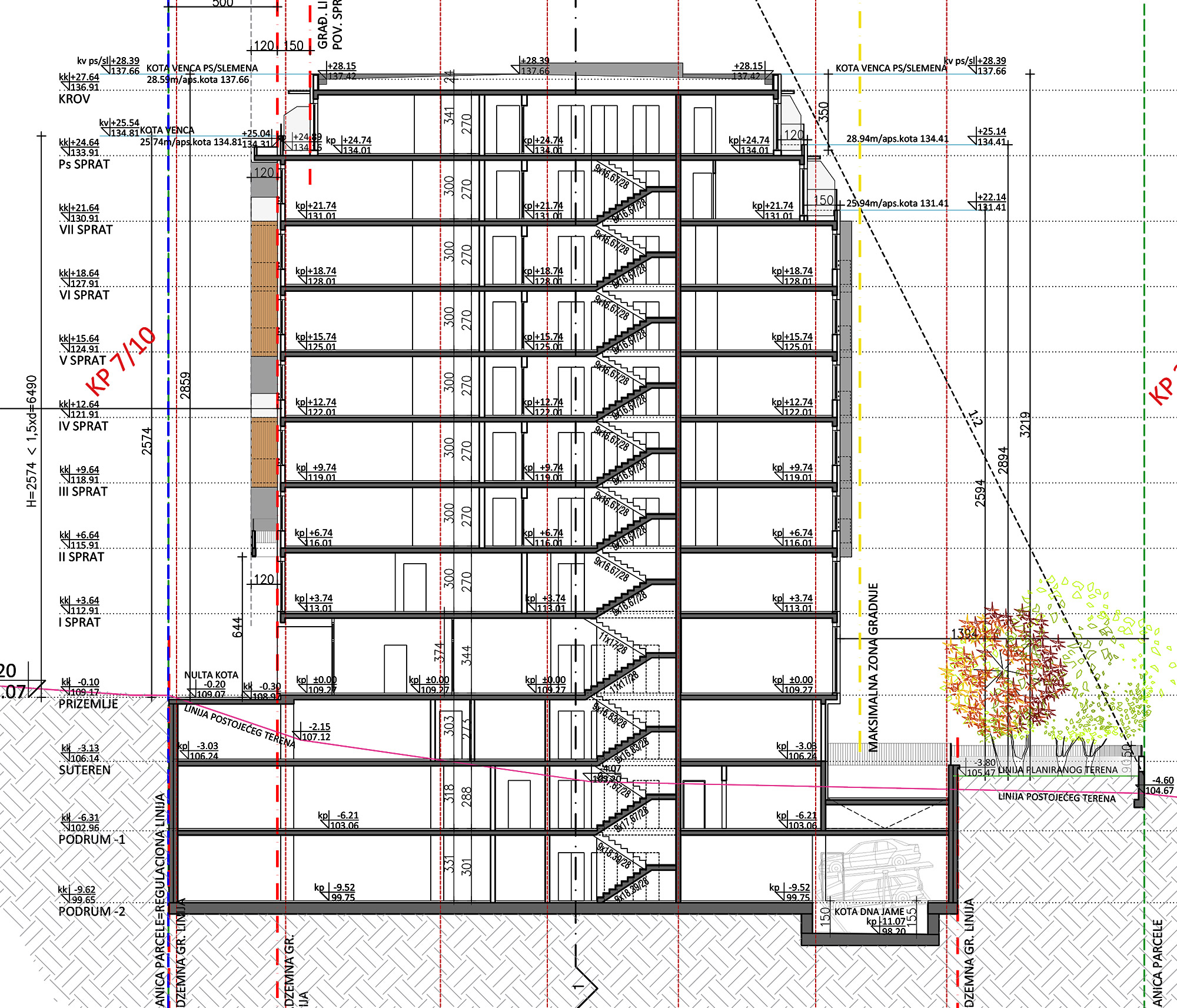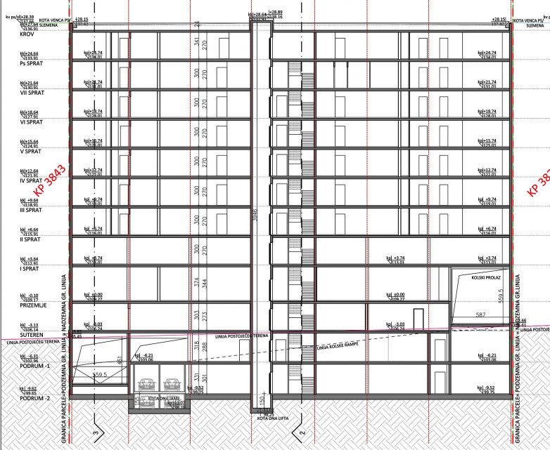 U suterenskoj i podrumskim etažama planirane su 3 garaže srednje veličine, odnosno 106 parking mesta od kojih je šest rezervisano za lica sa invaliditetom. Planirani su i mehanički sistemi višeetažnog parkiranja.