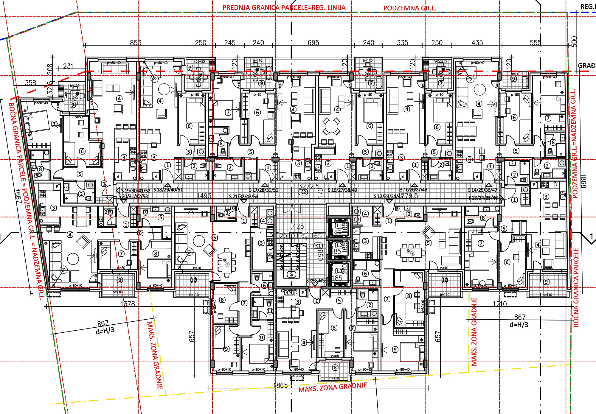 Na tipskom spratu (2-6) projektovano je 11, na 7. spratu 10, a na povučenom 8 stanova. Stanovi su različitih struktura: dvosobni, trosobni i četvorosobni.