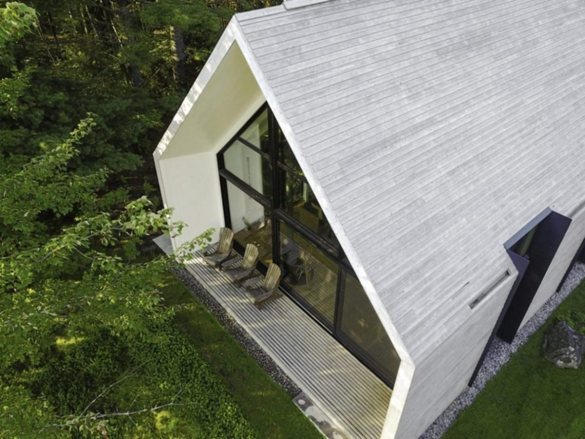 Krov i fasada objekta izvedeni su od belog kedrovog drveta, dok fasadu sa strane okrenute jezeru čine tri velika staklena panela koji omogućavajući prisnu povezanost unutrašnjosti objekta s okruženjem.