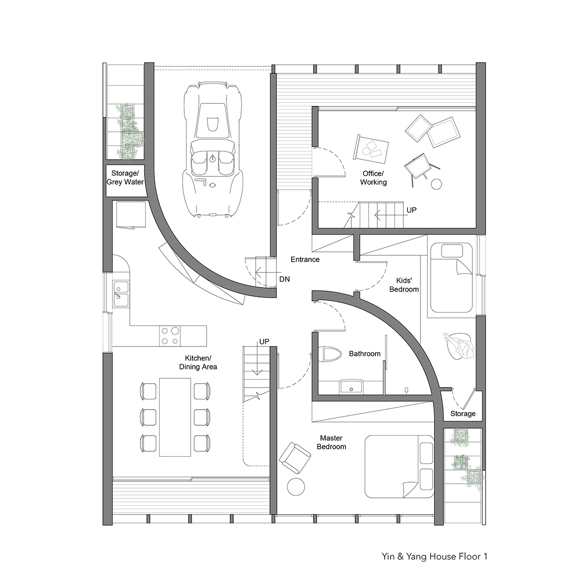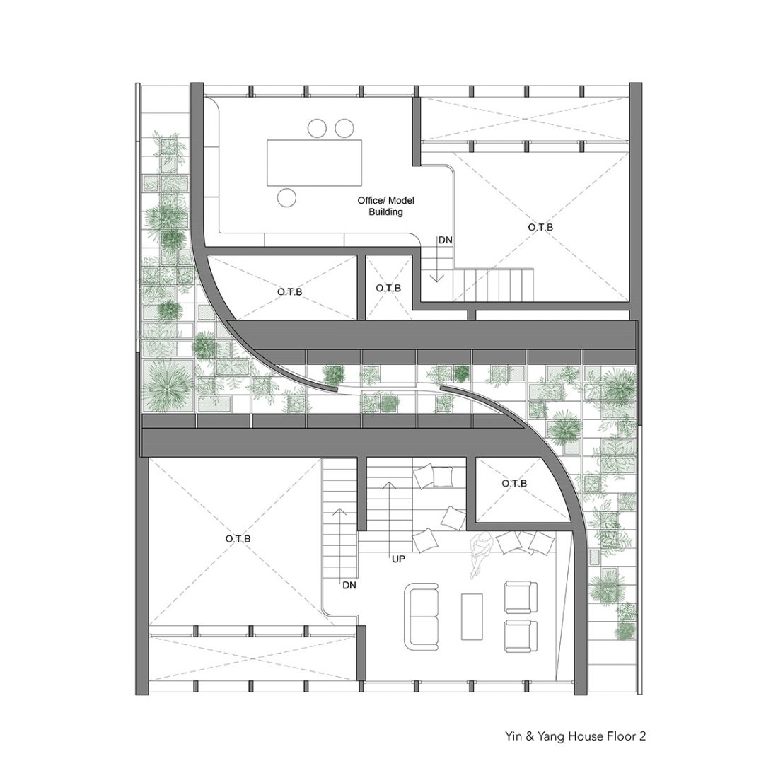 Baš kao i kod simbola jin i jang, dve glavne celine kuće, koje čine radni i životni prostor, međusobno su prepletene.