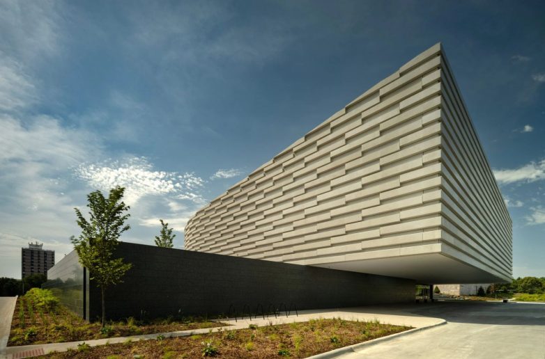 Glavni volumen zgrade ima zakrivljeni oblik i obložen je tankim betonskim panelima, koji su sve više razuđeni kako se bliže istorijskim zgradama, otkrivajući staklenu fasadu.