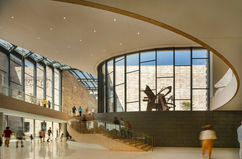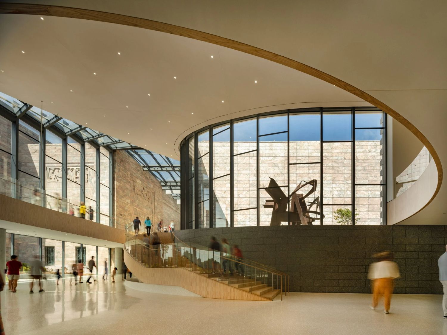 Nakon što prođu ispod duboke nadstrešnice paviljona Hawks, posetioci će ući u prostran, svetlom ispunjen atrijum koji ujedinjuje arhitektonsku istoriju muzeja sa blago strmim centralnim stepeništem koje se uzdiže kako bi formiralo produžetak staklenog atrijuma dizajniranog od strane Normana Fostera, kao deo proširenja muzeja iz 1994. godine.