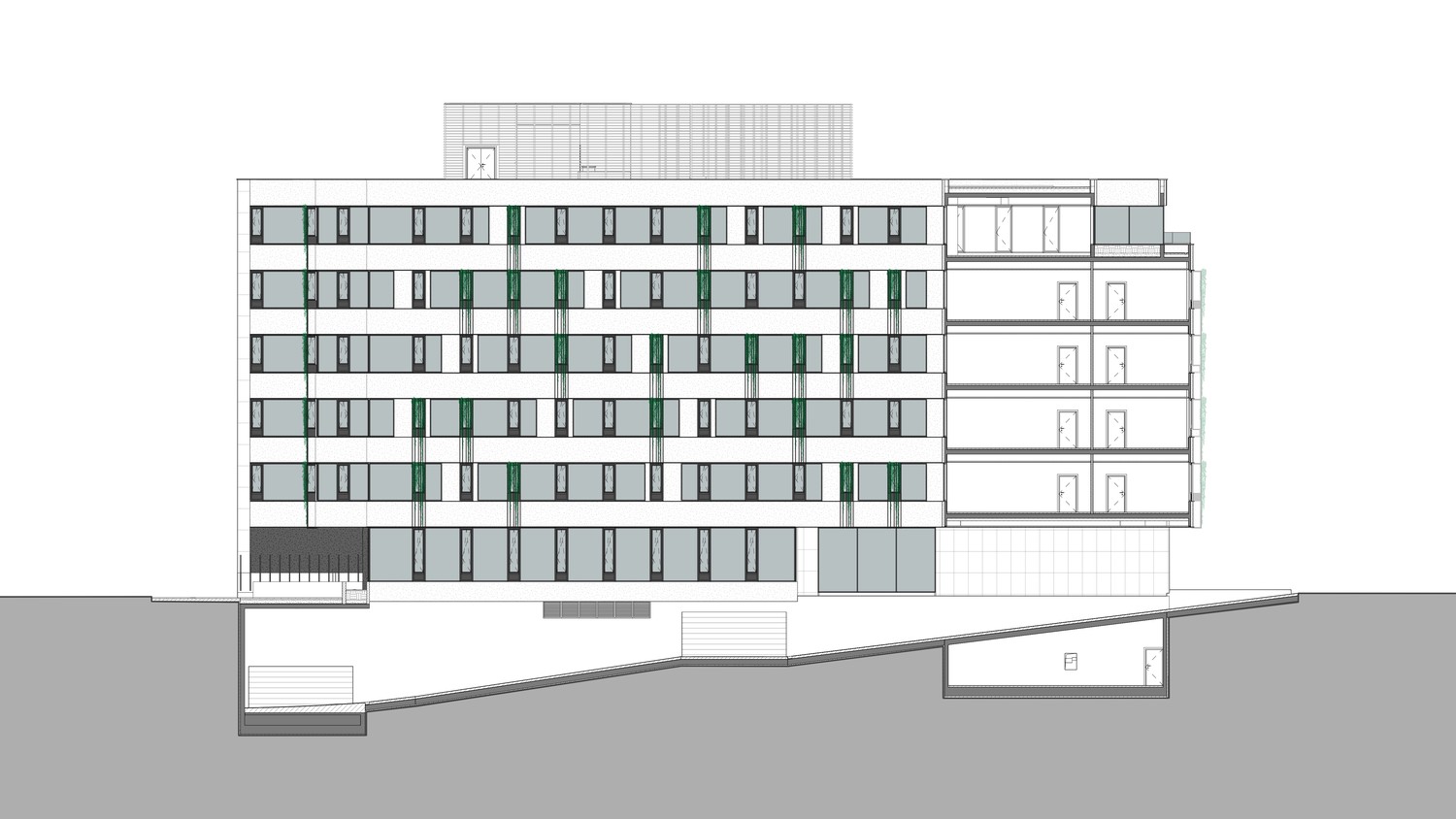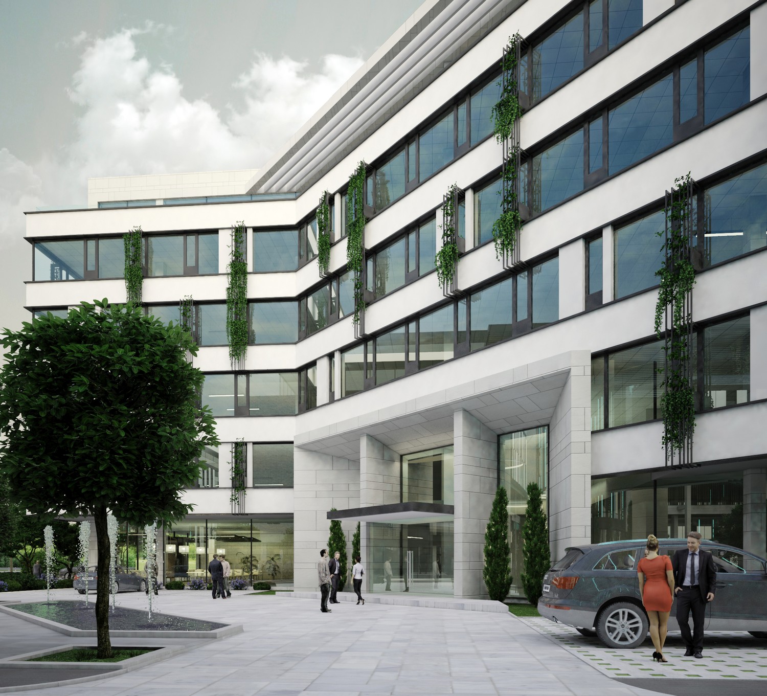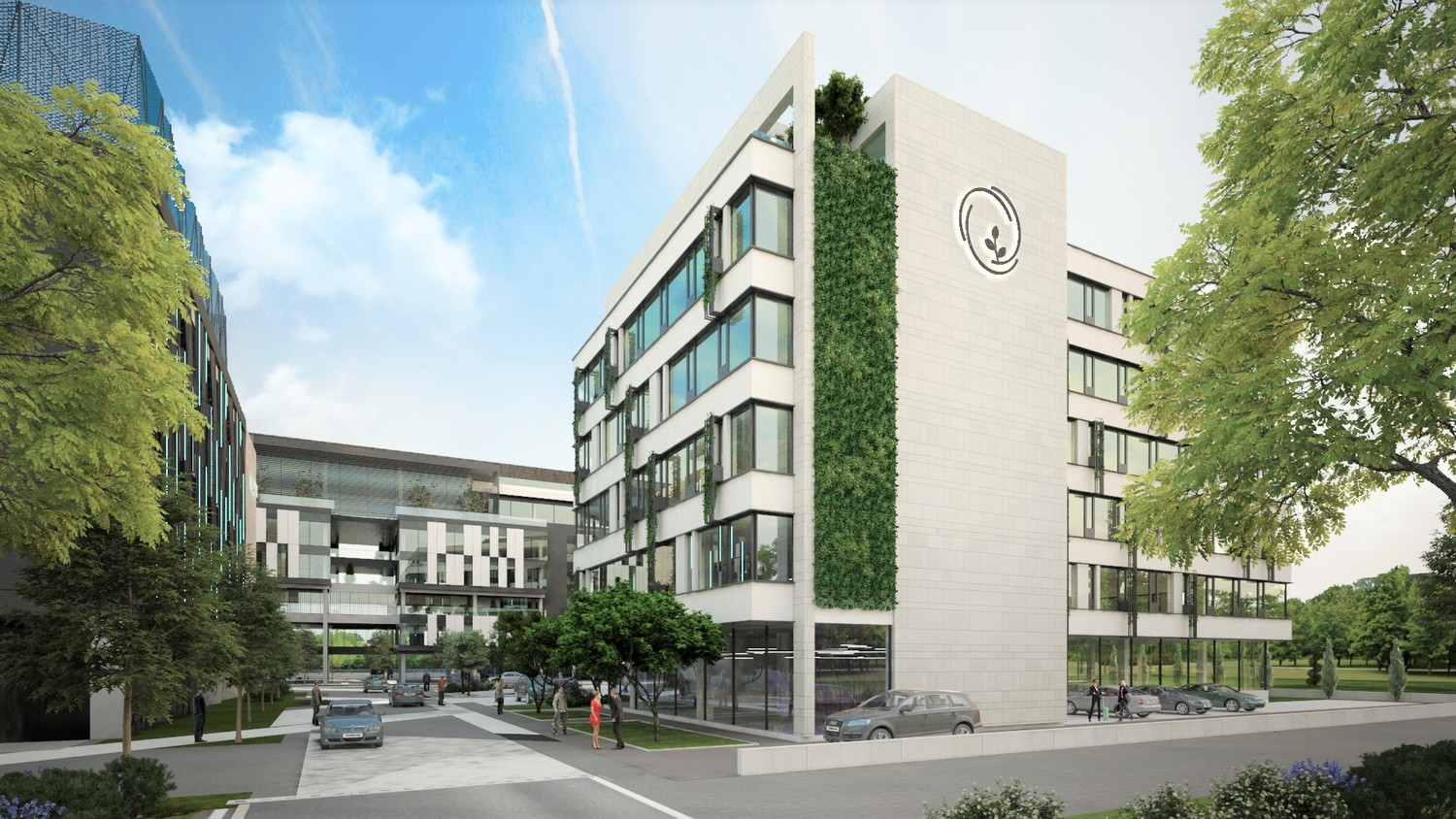 Obe bočne prilazne fasade naglašene su preplitanjem belih površina i „zelenog zida“. Ovi elementi prožimaju bazičnu formu i povezuju bele horizontale dajući savremeni izgled objektu. Paralelno sa tim, naglašava se „zeleni“ aspekt objekta i budućeg planiranog kompleksa u okruženju. Na nivou kompleksa, korekcija nedostataka modernističkog urbanizma vrši se kroz povratak alternativnim modelima urbanog razvoja utemeljenim u obrascima tradicionalnog grada.