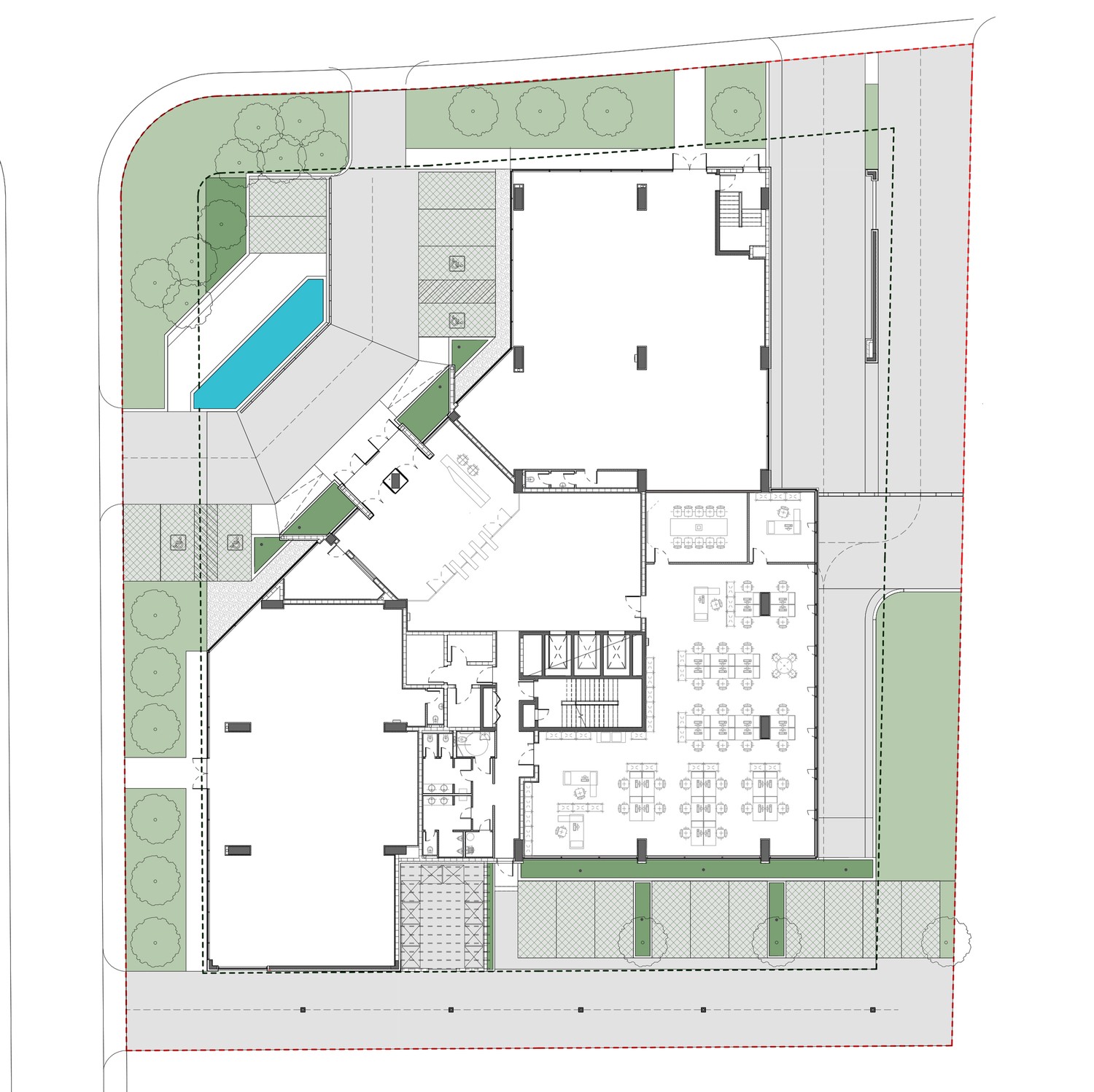Princip povratka morfologiji tradicionalnog grada primenjen je na izlomljeni oblik objekta koji formira pjacetu kao centralni prostorni motiv bloka ali i šireg okruženja. Pjaceta kao težište događaja stvara prostornu dinamiku uređene forme i oslikava savremeni duh poslovnih objekata koje treba da karakteriše uređenost i sigurnost sa jedne i dinamika, čovekomernost i prilagodljivost sa druge strane.