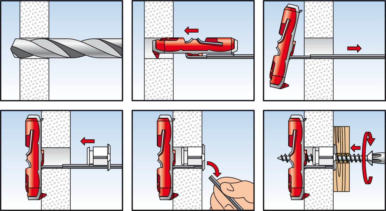 Tada se umetak ispravlja upravno na zid čime se opterećenje raspoređuje na veću površinu gipsa. Meki deo sive boje na umetku omogućava lepo prianjanje sa zadnje strane gipsane ploče.