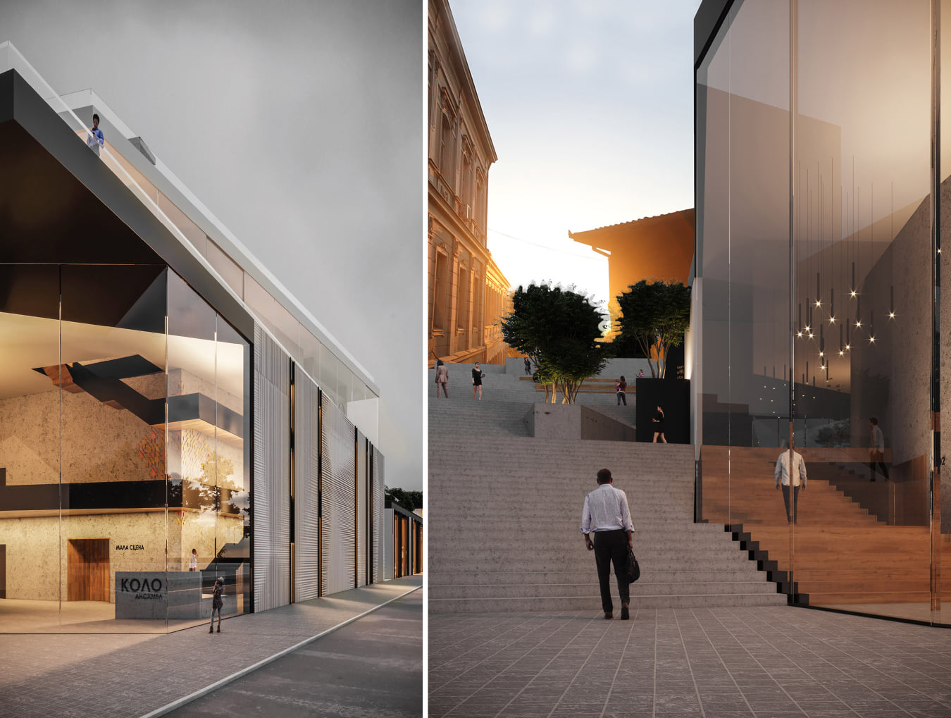 Cilj je bio uklapanje objekta u kontekst grada pa je objekat koncipiran kao nastavak javnog prostora Kosančićevog venca.