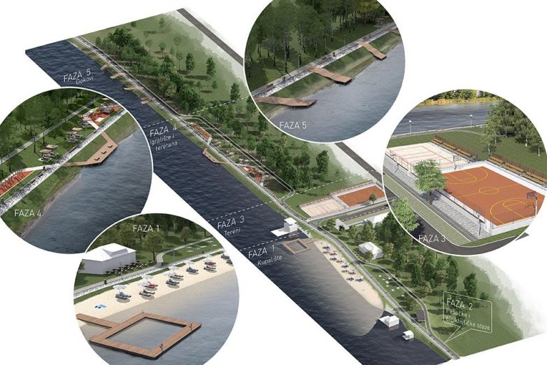 Pored odbojkaškog i košarkaškog terena, dizajnirano je dečije igralište, teretanu na otvorenom, moderno šetalište i biciklističku stazu. Na samoj vodi nalaze se drvene platforme za pecanje, sunčanje i druženje, dok je celom dužinom šetališta raspoređen moderno dizajniran urbani mobilijar. Na kraju šetališta revitalizovana je popularna peščana plaža Šlajz, dok će najmlađe obradovati plutajući bazen za neplivače.