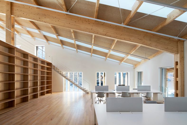 Enterijer je izveden u formi otvorenog koncepta, a radni prostor smešten je po obodu zgrade i na galeriji.